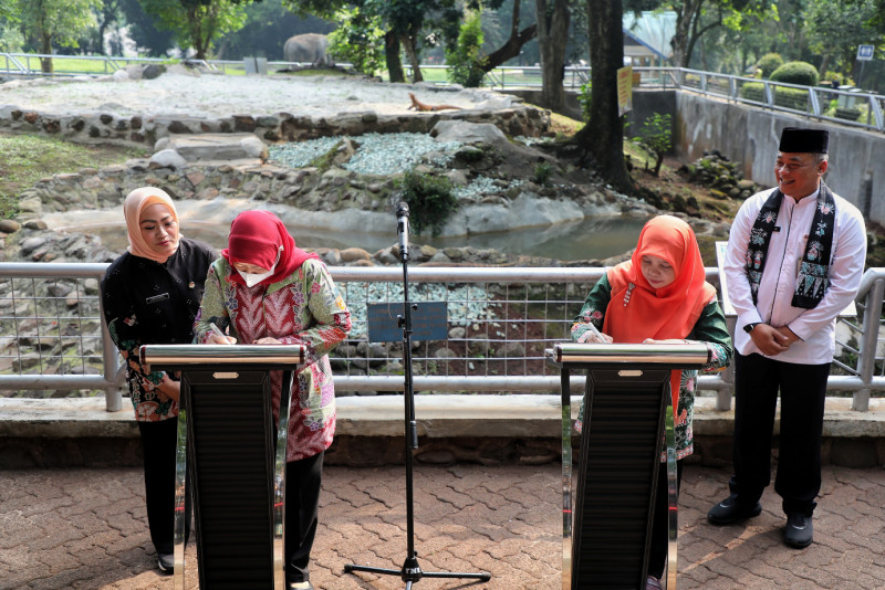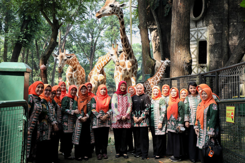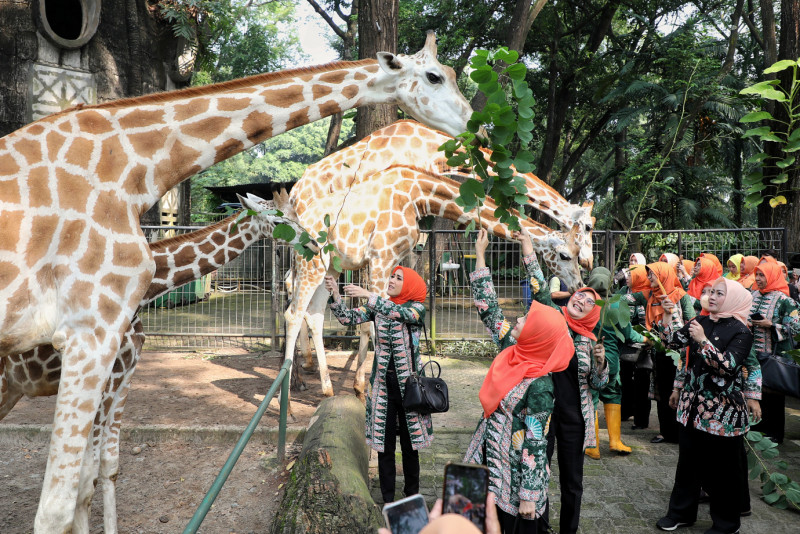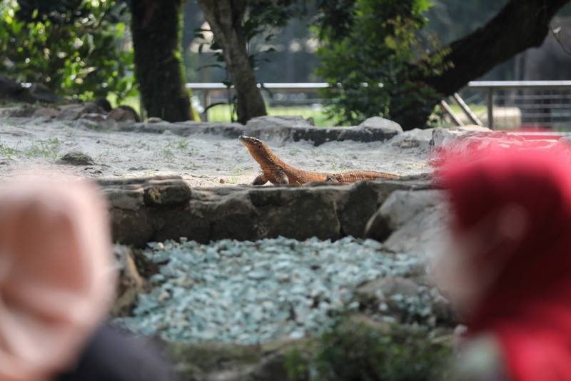 Penasihat Dharma Wanita Persatuan (DWP) Pemprov DKI Jakarta, Mirdiyanti Budi Hartono bersama Ketua Dharma Wanita Persatuan (DWP) DKI Jakarta, Endang Lestari Joko memberi nama dua komodo yang berada di Taman Margasatwa Ragunan (TMR), Pasar Minggu, Jakarta Selatan, Jumat (26/5). Dua nama pada komodo tersebut berasal dari singkatan Pj (Penjabat) yakni, Polita untuk komodo betina dan Juma untuk komodo jantan.