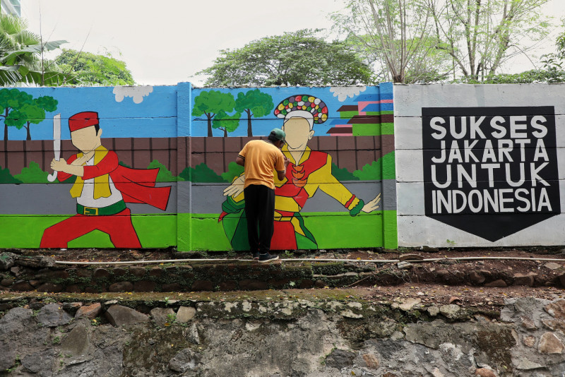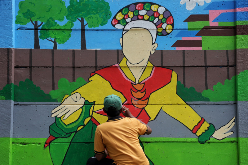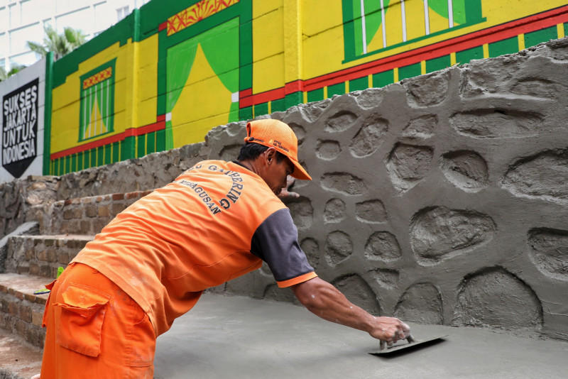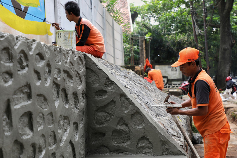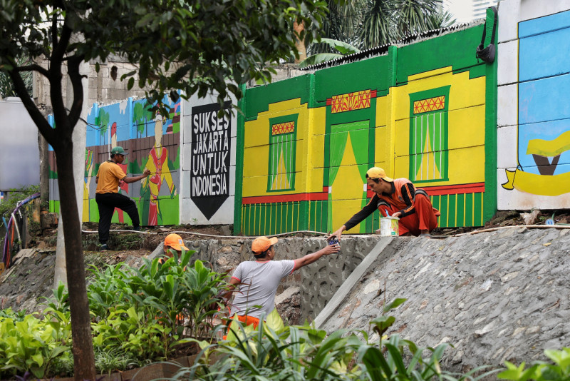 Sejumlah petugas PPSU Kebagusan melakukan penataan kawasan unggulan di lahan tidur RW 02, Jalan TB Simatupang, Kebagusan, Pasar Minggu, Jakarta Selatan, Selasa (29/5). Lahan tidur berukuran sekitar 27x5 meter tersebut ditata menjadi taman dan dibuat mural dengan tema kebudayaan Betawi.