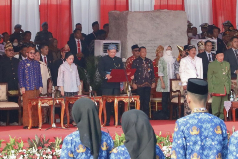 Penjabat (Pj) Gubernur DKI Jakarta, Heru Budi Hartono menghadiri upacara peringatan Hari Lahir (Harlah) Pancasila di Monumen Nasional (Monas), Jakarta Pusat, Kamis (1/6). Bertindak sebagai Inspektur Upacara dalam peringatan Hari Lahir Pancasila yakni Presiden RI, Joko Widodo.