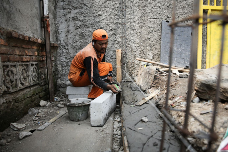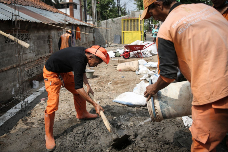 Petugas Penanganan Prasarana dan Sarana Umum (PPSU) Kelurahan Johar Baru merapikan lahan tidur di Kampung Rawa Sawah, Gang Delima II, Kecamatan Johar Baru, Jakarta Pusat, Kamis (1/6). Lahan seluas 120 meter persegi tersebut akan dibangun kolam gizi, instalasi hidroponik, serta dipercantik dengan mural.