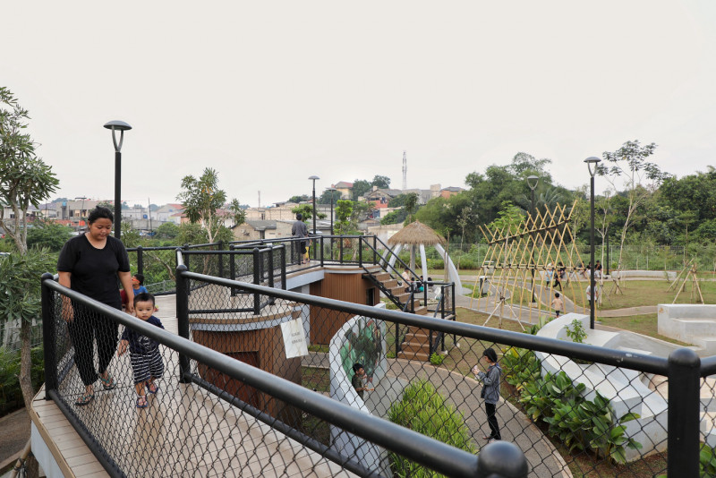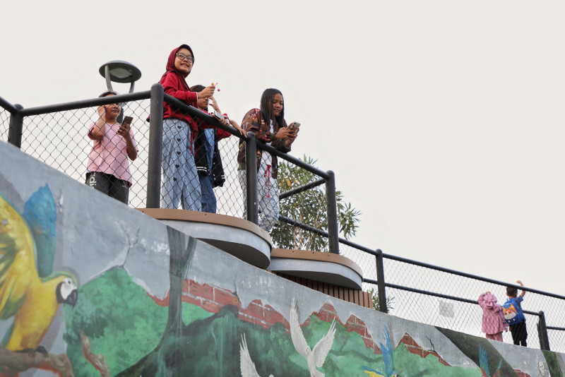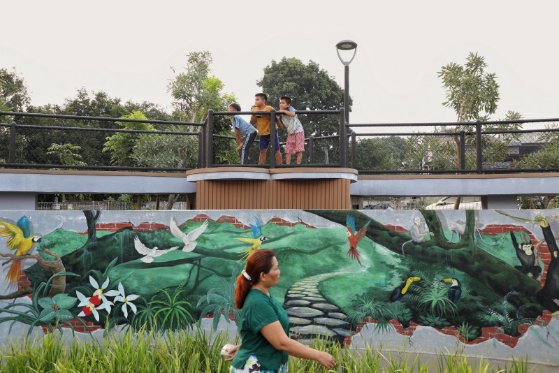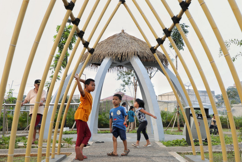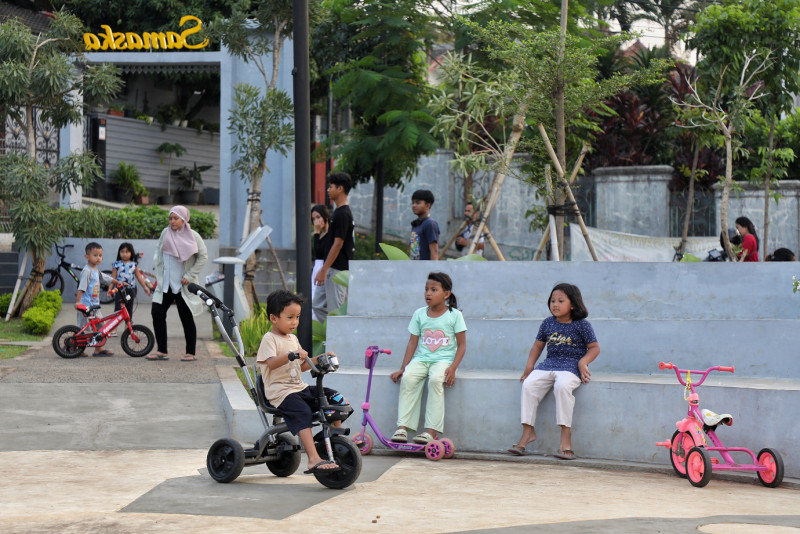 Sejumlah anak bermain di Taman Samaska, Gang Haji Saibun RT 02/09 Kelurahan Jati Padang, Pasar Minggu, Jakarta Selatan, Kamis (1/6). Taman baru milik Pemprov DKI tersebut memiliki luas 2.947 meter persegi ini memiliki sejumlah fasilitas yang menarik diantaranya yakni mini lapangan basket, area viewing deck, dinding mural, jalur refleksi, kolam ikan serta area bermain anak.