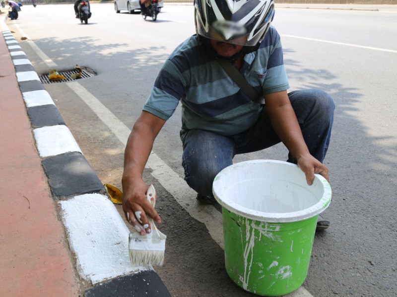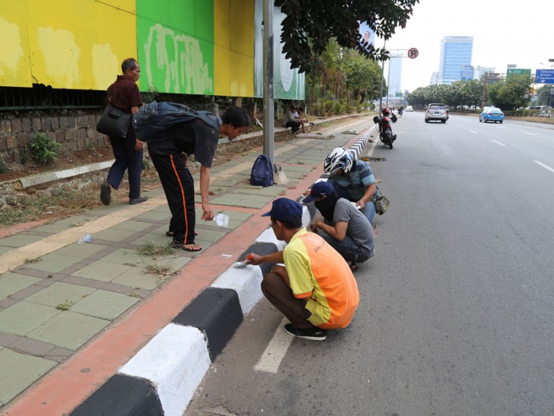 Untuk menyambut Hari Kemerdekaan ke-70 Republik Indonesia, Pemprov DKI Jakarta berbenah dengan memperindah lingkungan dan melakukan pengecatan ulang kanstin yang sudah kusam. Pengecatan kanstin dilakukan puluhan tenaga Penanganan Prasarana dan Sarana Umum (PPSU) di setiap kelurahan di DKI Jakarta. Pantauan beritajakarta.com , pengecatan kanstin antaran lain dilakukan di Jl Gatot Subroto, Jl Jenderal Sudirman, dan kawasan Kebayoran Lama, Rabu (29/7) (Foto: Yopie/beritajakarta.com)