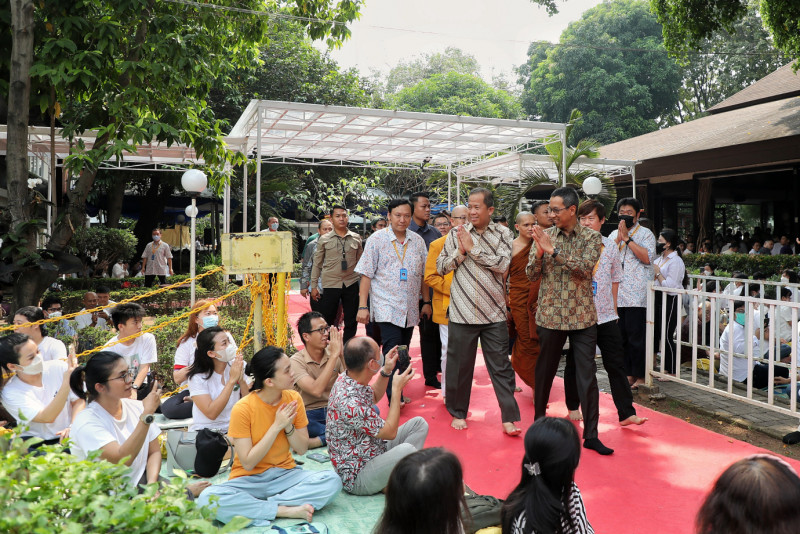 Penjabat (Pj) Gubernur DKI Jakarta, Heru Budi Hartono menghadiri Visakha Punnami Puja 2567 / 2023 dalam rangka memperingati Hari Trisuci Waisak di Vihara Jakarta Dhammacakka Jaya, Jalan Sunter Permai, Jakarta Utara, Minggu (4/6). Dalam sambutannya, Heru yakin dan optimistis umat Buddha di Jakarta mampu memberikan kontribusi positif dalam kehidupan bermasyarakat.