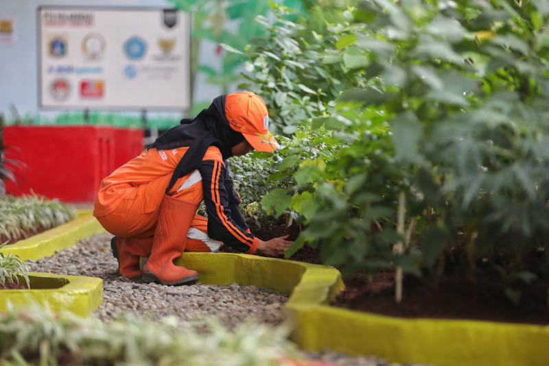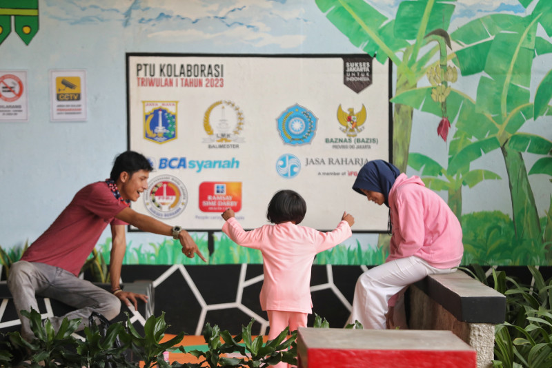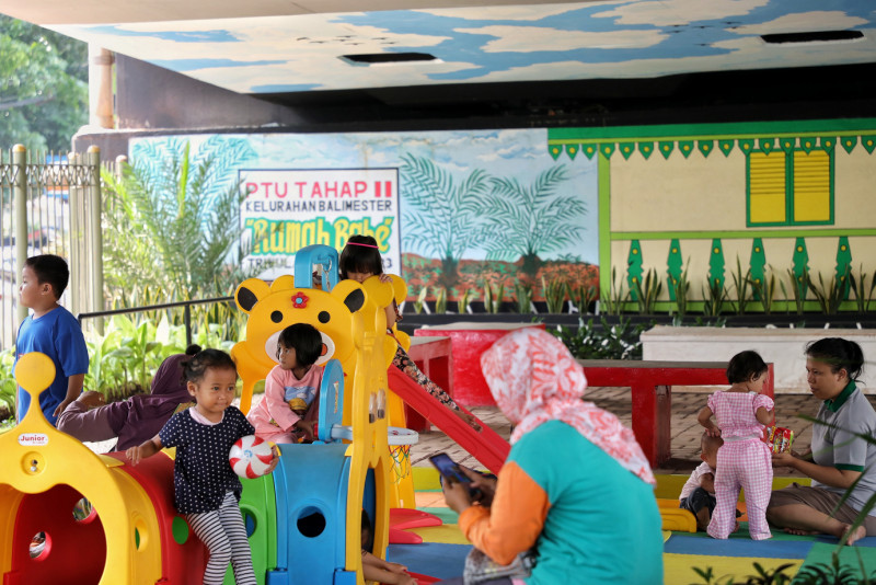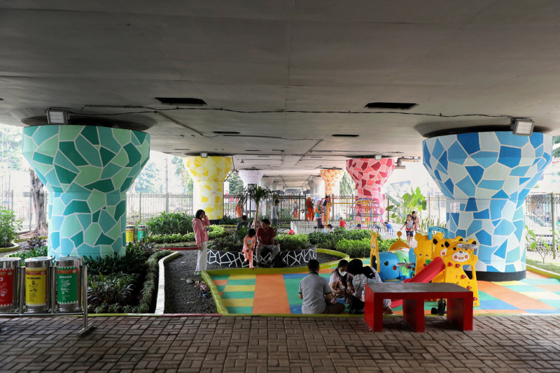 Sejumlah anak bersama orang tuanya di area Penataan Titik Unggulan (PTU) Rumah Babe, Kelurahan Bali Mester, Jatinegara, Jakarta Timur, Selasa (6/6). Kehadiran PTU yang berada di Kolong Fly Over Kampung Melayu, kini menjadi tempat ruang interaksi warga sekitar.
