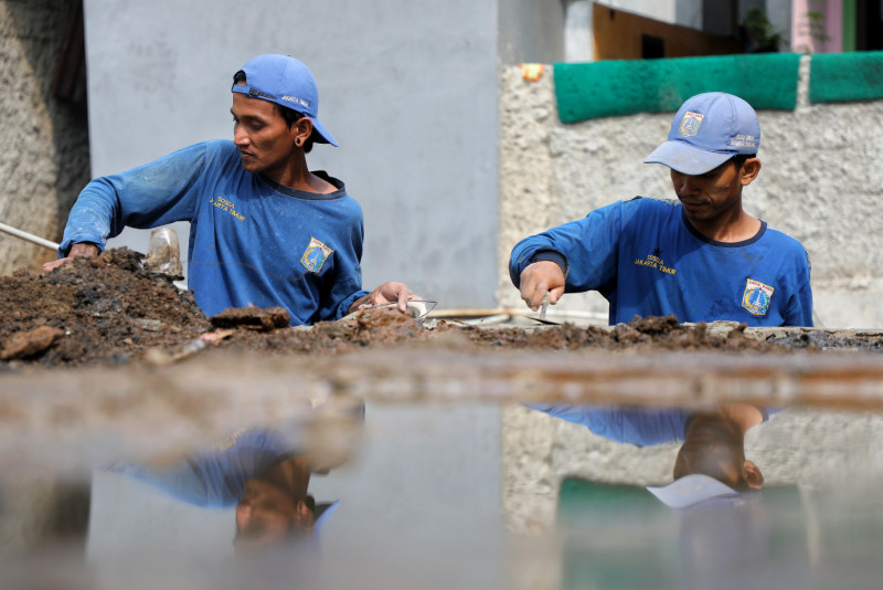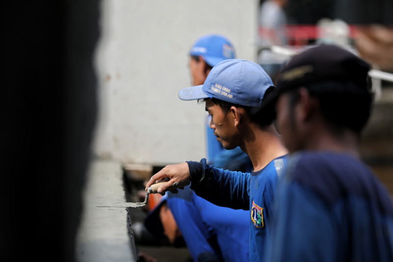 Petugas Suku Dinas Sumber Daya Air (Sudin SDA) Jakarta Timur melakukan perbaikan turap Kali Baru yang longsor di Jalan Raya Bogor RT 01/04 Kelurahan Kramat Jati, Kecamatan Kramat Jati, Jakarta Timur, Rabu (7/6). Turap sepanjang 7,5 meter dengan ketebalan 40 - 50 sentimeter diperbaiki sejak 23 Mei dan saat ini pengerjaan sudah mencapai 90 persen.