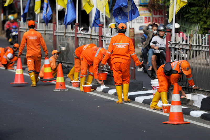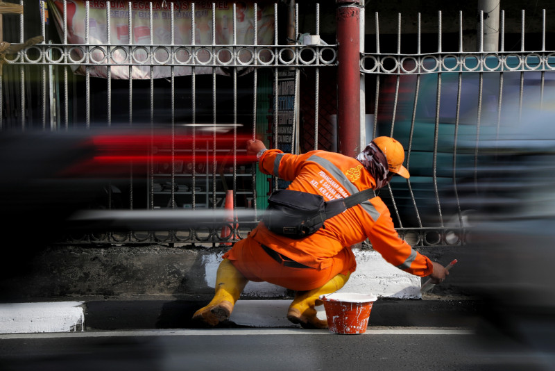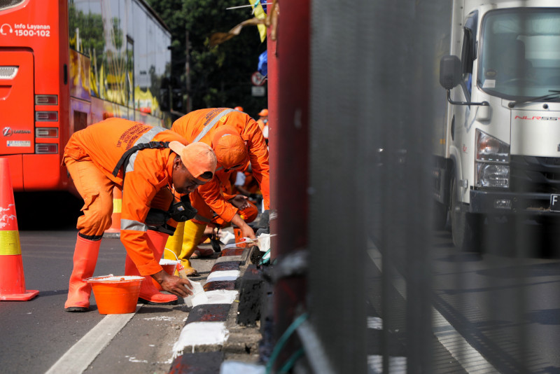 Petugas Penanganan Prasarana dan Sarana Umum (PPSU) Kelurahan Kramat Jati mengecat ulang kanstin di Jalan Raya Bogor, Kramat Jati, Jakarta Timur, Kamis (8/6). Pengecatan ulang kanstin dilakukan agar terlihat lebih bersih dan indah menjelang perayaan HUT DKI Jakarta ke-496.
