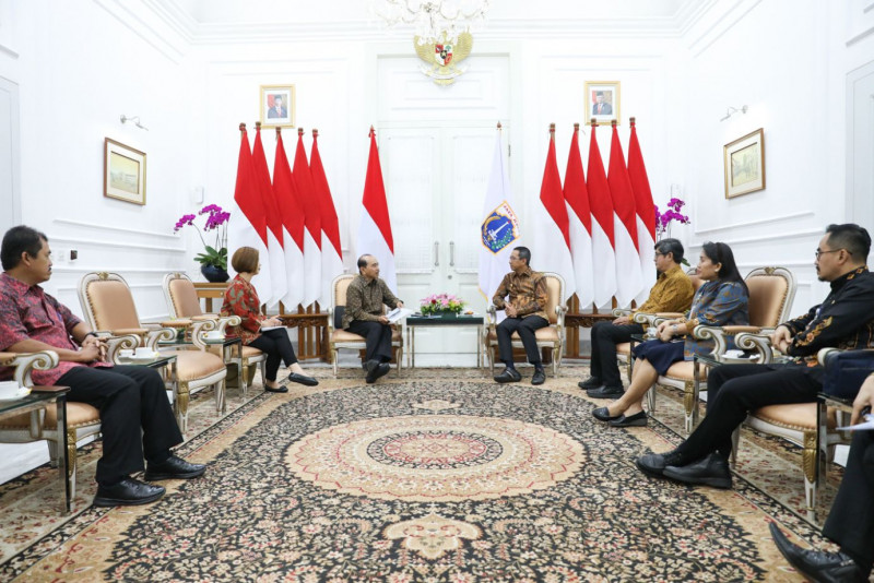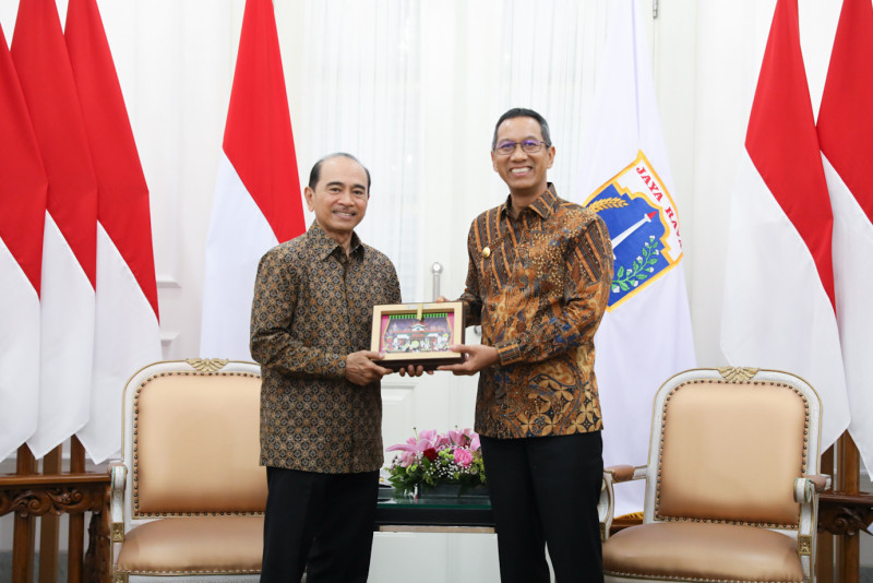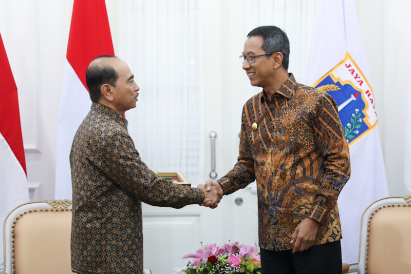 Penjabat (Pj) Gubernur DKI Jakarta, Heru Budi Hartono menerima kunjungan Duta Besar Republik Indonesia (Dubes RI) untuk Perancis, Mohamad Oemar di Ruang Tamu Gubernur, Balai Kota DKI Jakarta, Kamis (8/6). Kunjungan tersebut membahas kerja sama promosi terpadu seperti investasi, perdagangan, seni budaya, kuliner dan pariwisata Kota Jakarta di Paris pada bulan September sampai Oktober 2023.