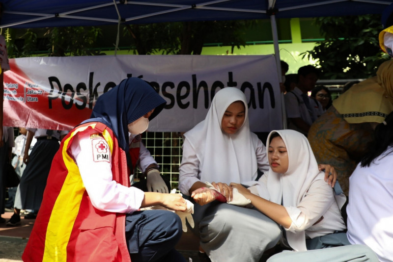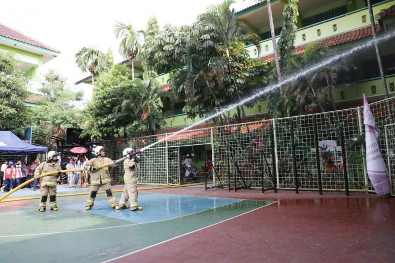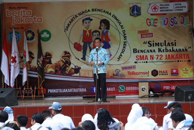Palang Merah Indonesia (PMI) Jakarta Utara bersama Suku Dinas Penanggulangan Kebakaran dan Penyelamatan (Gulkarmat) Jakarta Utara menggelar kegiatan PMI Goes to School di SMAN 72 Kelapa Gading, Jakarta Utara, Kamis (8/6). Sebanyak 571 siswa-siswi terlibat mengikuti simulasi kebakaran berikut penanganan korban bencana.