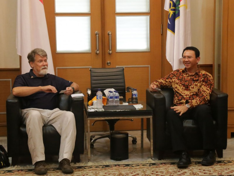 Gubernur DKI Jakarta, Basuki Tjahaja Purnama menerima kunjungan US Profesional Fellows Program dan pengurus Asosiasi Pemerintah Kota Seluruh Indonesia (APEKSI) di Balaikota DKI Jakarta, Kamis (30/07/2015). Dalam diskusi ini memaparkan berbagai hal terkait pembangunan perkotaan, penataan pemukiman kumuh dan penataan PKL Selain itu Basuki juga menjelaskan perkembangan kemajuan kota Jakarta, salah satunya tentang Jakarta Smart City dan CCTV yang bisa di akses dengan telepon genggam. (Foto : Reza/Beritajakarta.com)