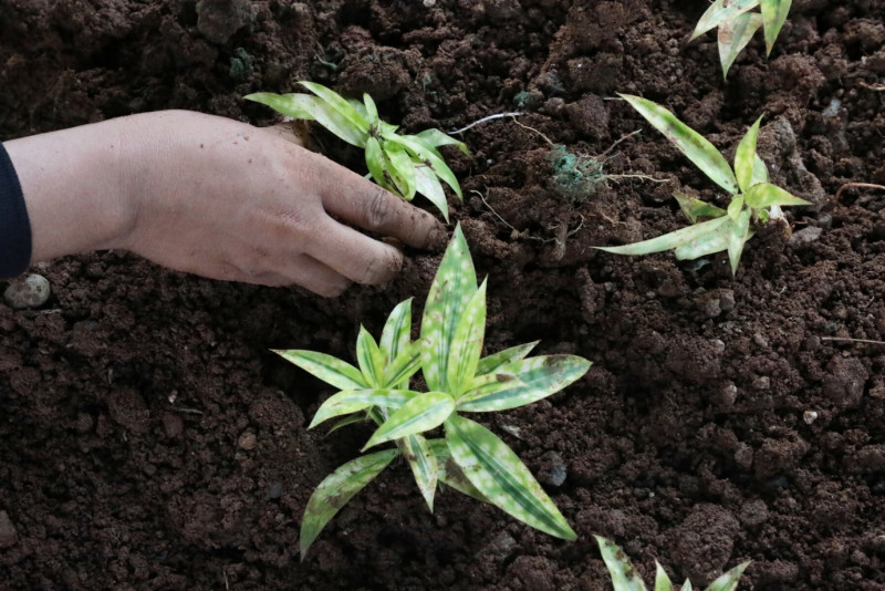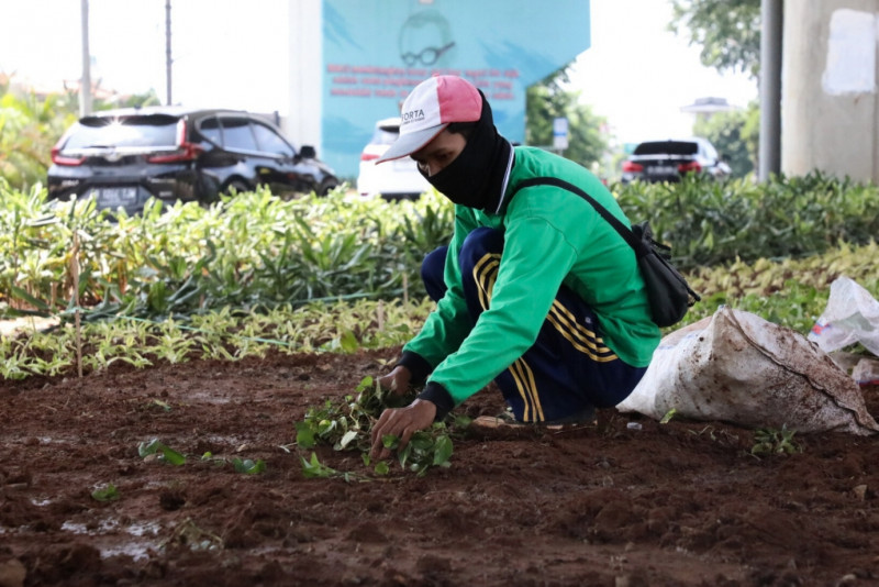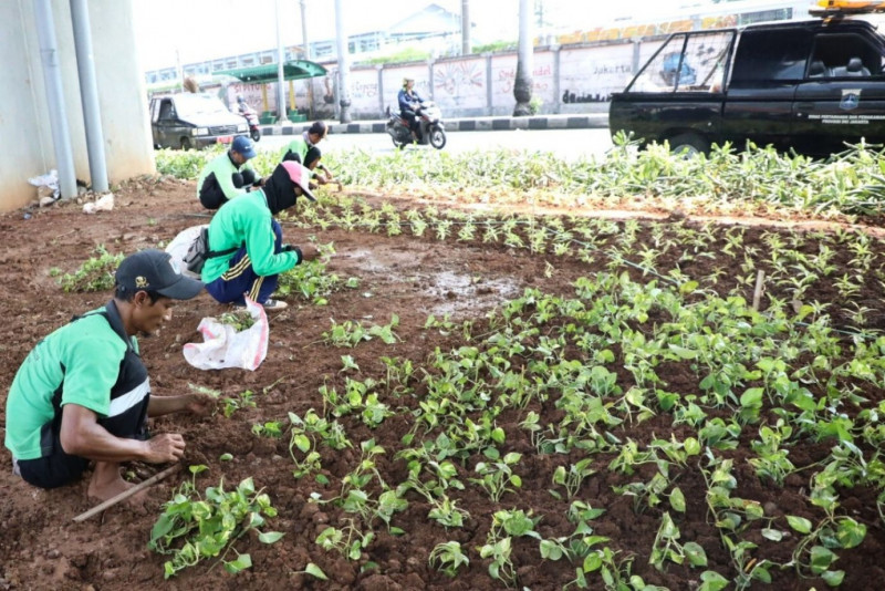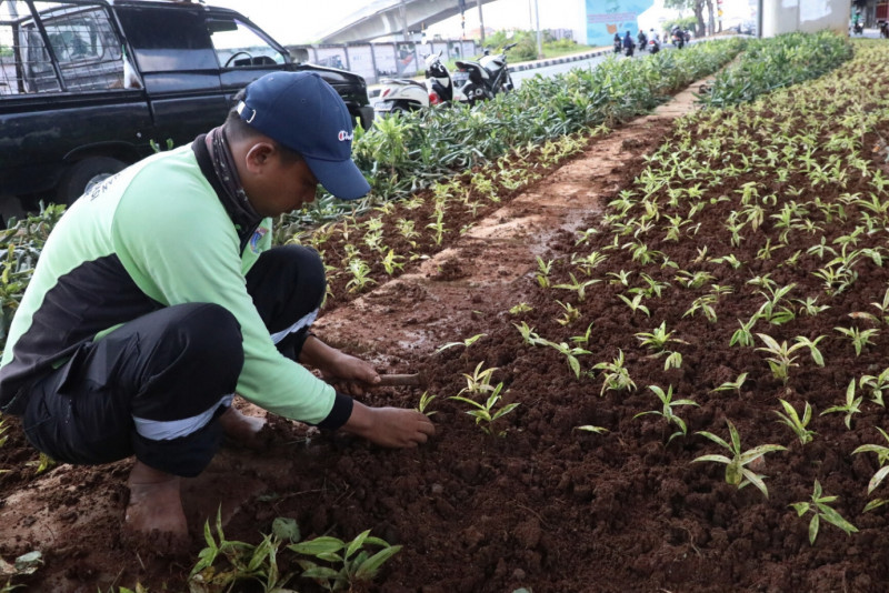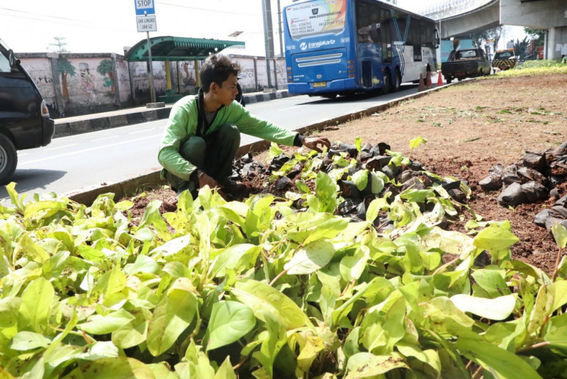 Petugas Suku Dinas Pertamanan dan Hutan Kota (Sudin Tamhut) Jakarta Timur melakukan penataan ulang area taman jalur hijau di kolong Flyover Cipinang Lontar, Jatinegara, Jumat (9/6). Area seluas 160x8 meter persegi ditanami 15.000 polybag tanaman hias seperti sirih gading, grasena golden dan pilow kuning. Pengerjaan ini ditargetkan selesai pada akhir bulan Juni mendatang.