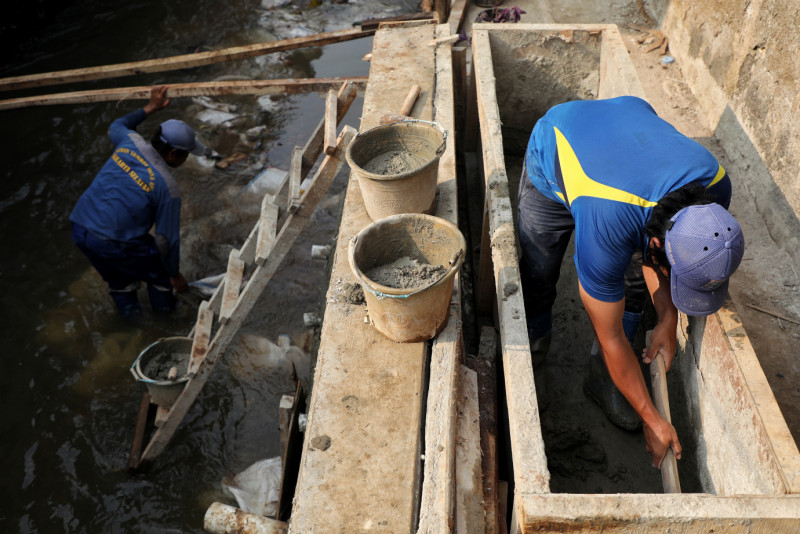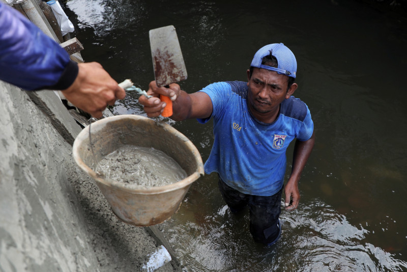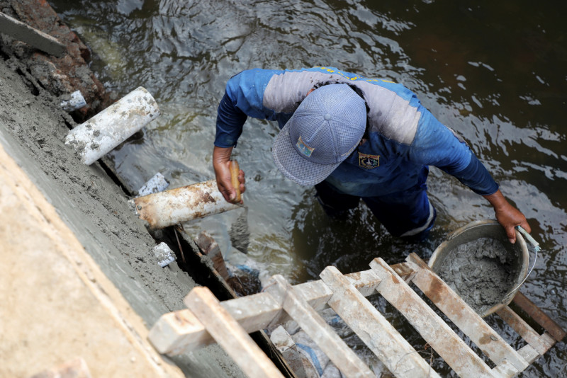 Petugas Suku Dinas Sumber Daya Air (Sudin SDA) Jakarta Selatan melakukan pembuatan turap baru Kali Sarua di Jalan Jati Murni Dalam, Kelurahan Jatipadang, Kecamatan Pasar Minggu, Jakarta Selatan, Sabtu (10 /6). Pembuatan turap sepanjang 60 meter dengan tinggi tiga meter dilakukan untuk menjaga air agar tidak meluap ke lingkungan warga saat air sedang tinggi.