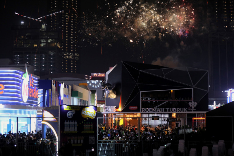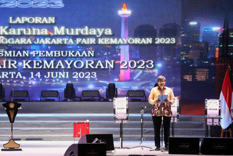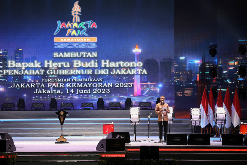 Penjabat (Pj) Gubernur DKI Jakarta, Heru Budi Hartono mendampingi Presiden Republik Indonesia (RI), Joko Widodo membuka secara resmi Jakarta Fair Kemayoran 2023 di Jakarta International Expo (JI Expo) Kemayoran, Rabu (14/6). Jakarta Fair Kemayoran tahun ini mengambil tema \"Bersatulah Indonesia mendukung perdagangan dalam negeri dan expor ke pasar dunia\", dengan sub tema \"warga bangsa Indonesia meningkatkan kreatifitas produk-produk Indonesia dan berjuang terus sampai sukses - Indonesia jaya, rakyatnya sejahtera\".
