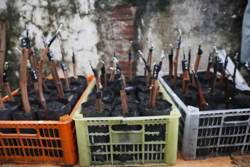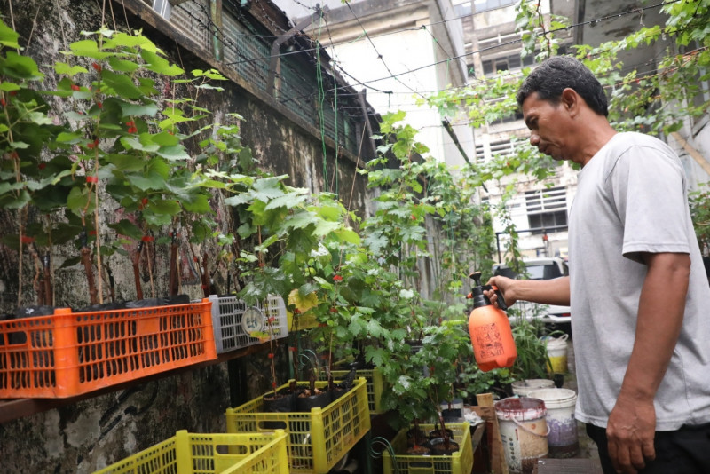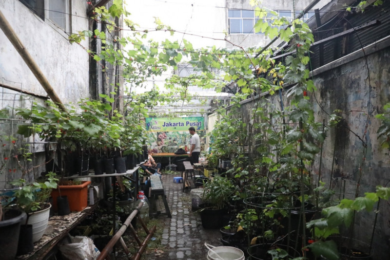 Komunitas Anggur Jakarta Pusat memanfaatkan lahan tidak terpakai menjadi kebun anggur CTC Grape di area gedung CTC di Jalan Kramat Raya, Kwitang, Senen, Jakarta Pusat, Jumat (16/6). Lahan seluas 50 meter persegi ini ditanami berbagai jenis anggur seperti harold, transfigurasi, jupiter, ninel, Akademik dan Veles.