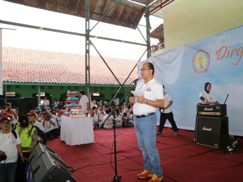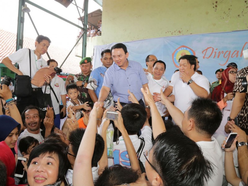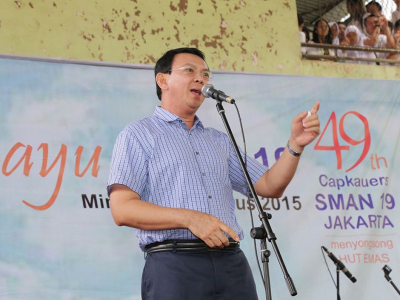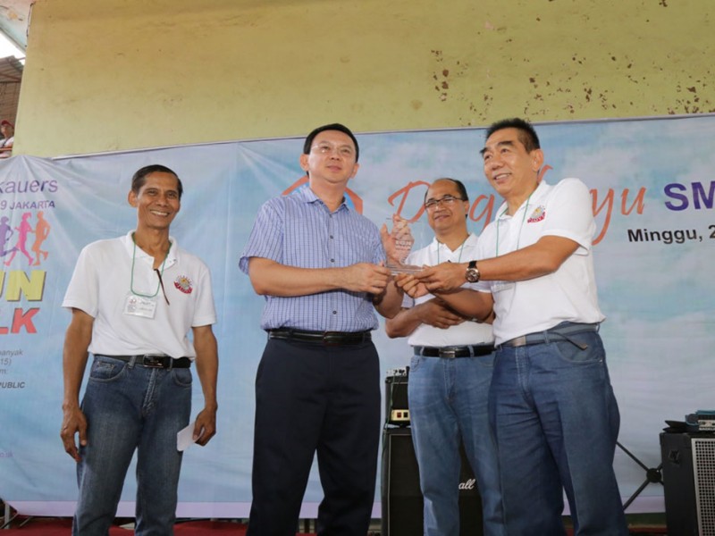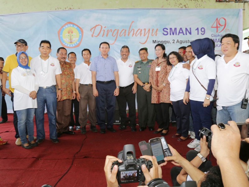 Gubernur DKI Jakarta, Basuki Tjahaja Purnama, menghadiri peringatan HUT ke-49 SMA Negeri 19, di Jalan Perniagaan, Tambora, Jakarta Barat, Minggu (02/08/2015). Peringatan HUT ke-49 SMA Negeri 19 diisi dengan kegiatan gerak jalan santai. Dalam kesempatan tersebut Basuki menyampaikan pesan agar jangan ada diskriminasi dalam dunia pendidikan di Indonesia khususnya di DKI Jakarta. (Foto: Yopie/beritajakarta.com)