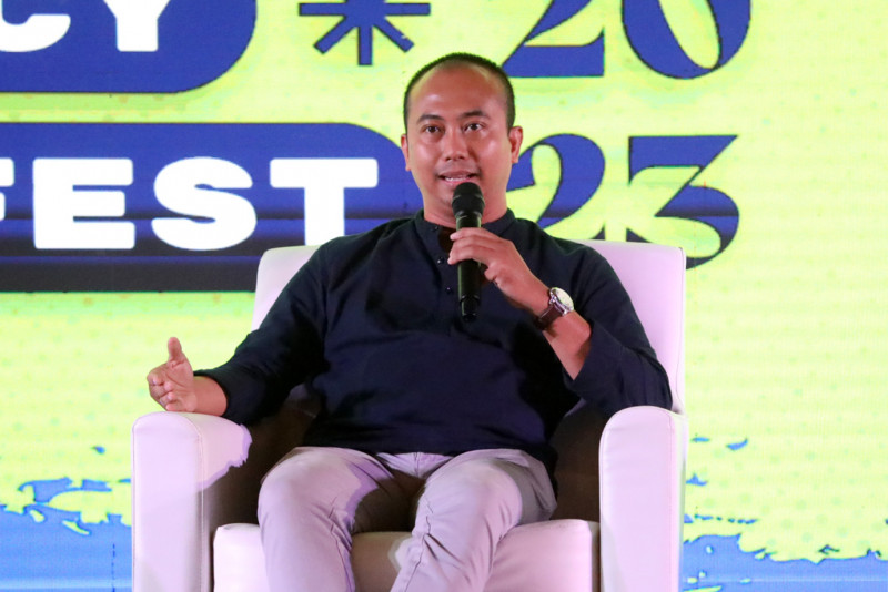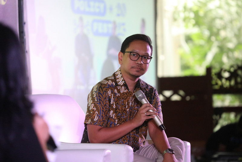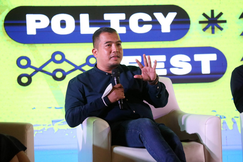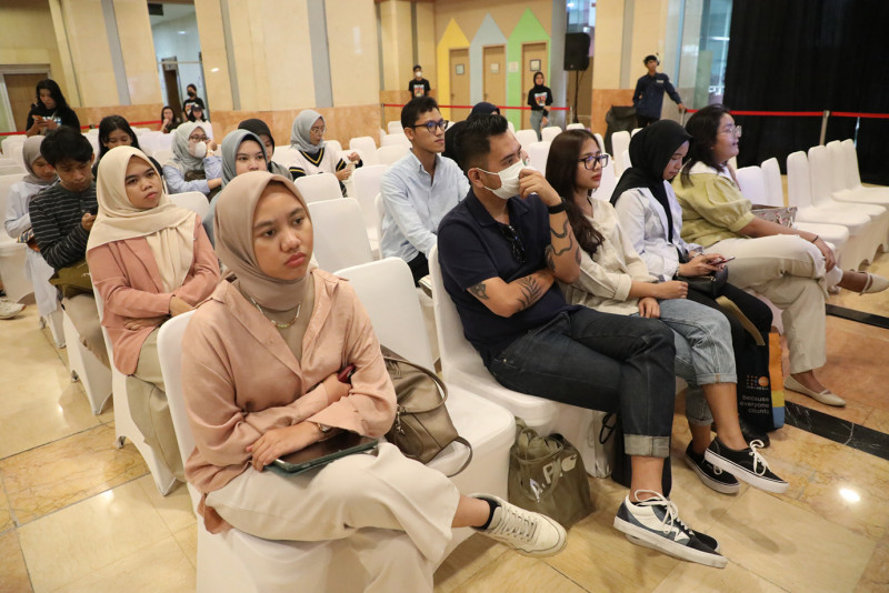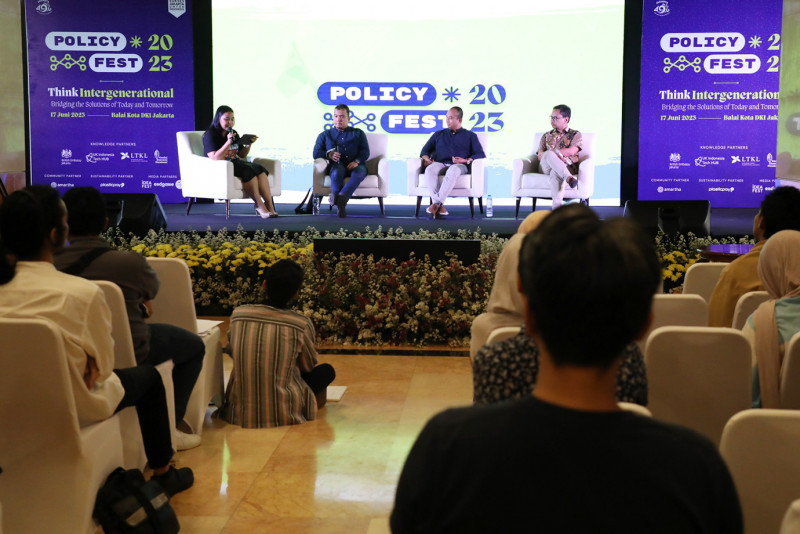 Puluhan generasi milenial mengikuti kegiatan Policy Fest 2023 yang diselenggarakan di Blok G, Balai Kota DKI Jakarta, Sabtu (17/6). Policy Fest hadir sebagai wadah untuk memfasilitasi publik agar lebih sadar, paham, dan terlibat dalam diskusi isu-isu terdepan kebijakan publik. Salah satunya talk show Ekonomi Digital bertajuk \"Kecerdasan Buatan dalam Kebijakan Publik: Menavigasi Kesempatan dan Tantangan\".