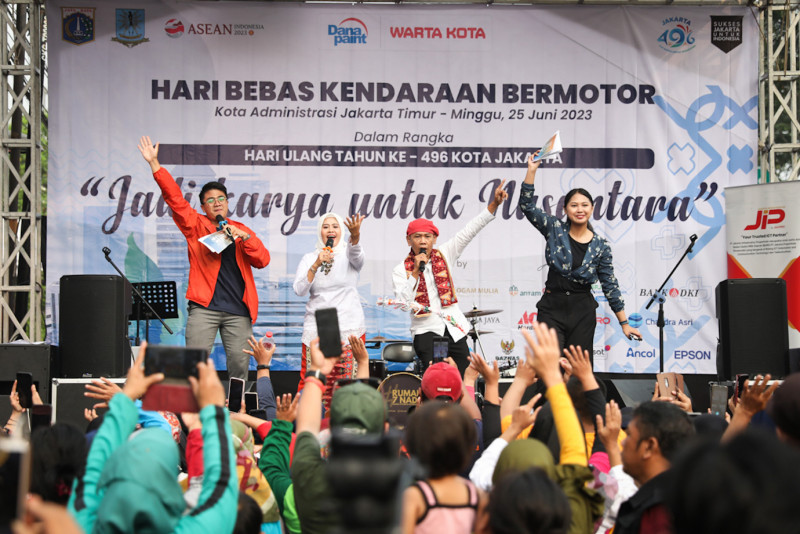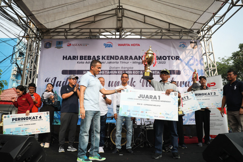 Penjabat (Pj) Gubernur DKI Jakarta, Heru Budi Hartono, menghadiri sekaligus menyerahkan piala penghargaan kepada pemenang Lomba Kampung Bersih se-Jakarta Timur saat pelaksanaan Hari Bebas Kendaraan Bermotor (HBKB) di Jalan Pemuda, Rawamangun, Jakarta Timur, Minggu (25/6). Heru berharap, para pemenang bisa menjadi inspirasi dan memberikan motivasi bagi RW lain untuk menjaga kebersihan lingkungan dari sampah demi mewujudkan Jakarta yang semakin bersih.