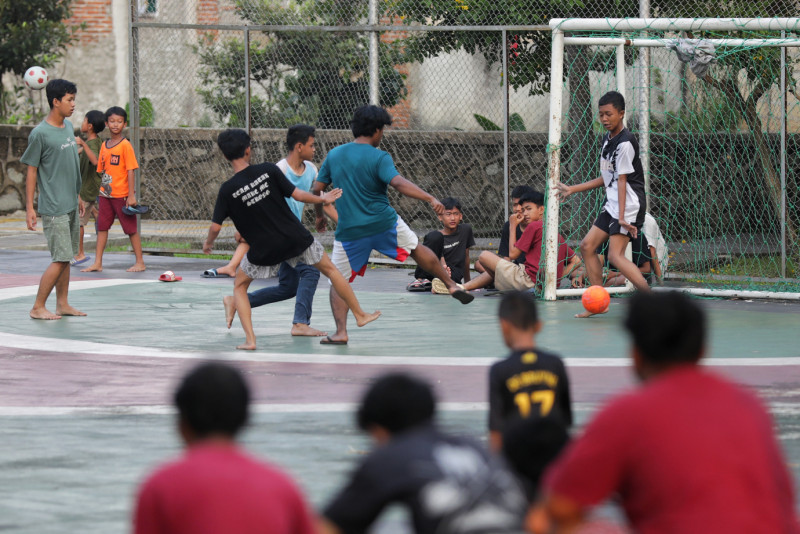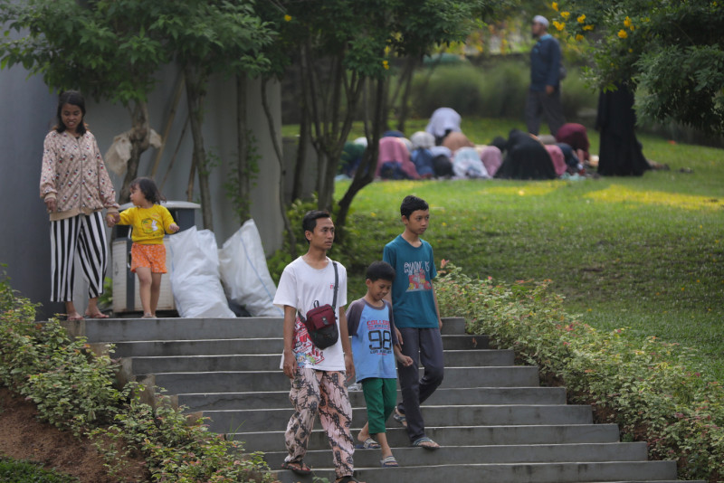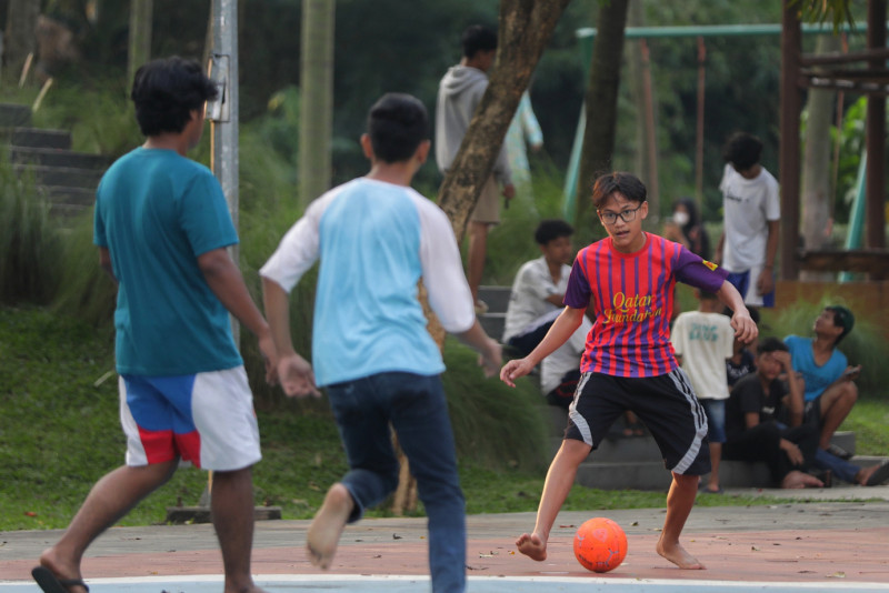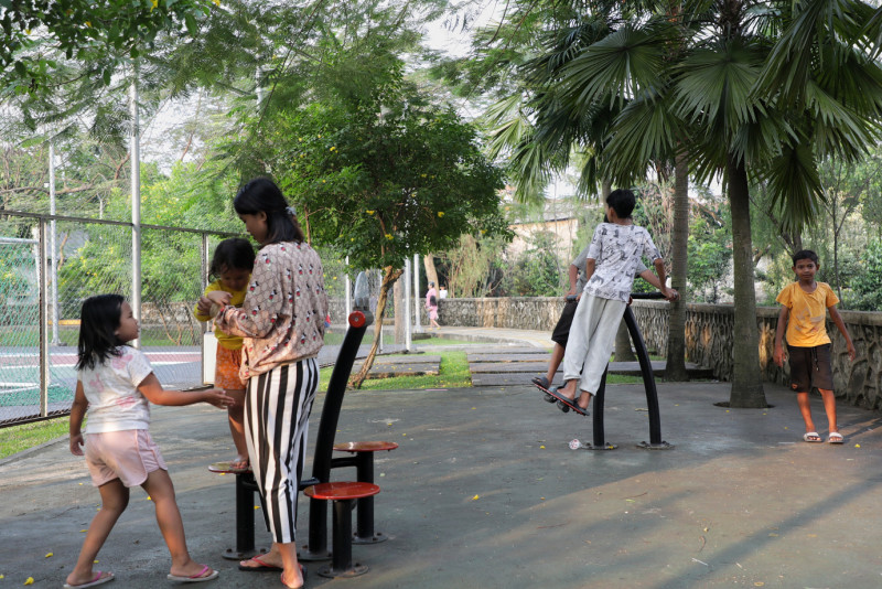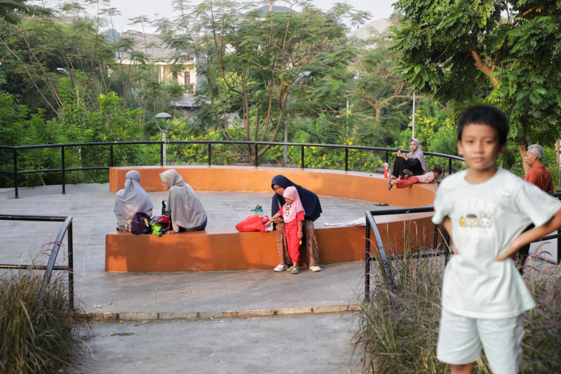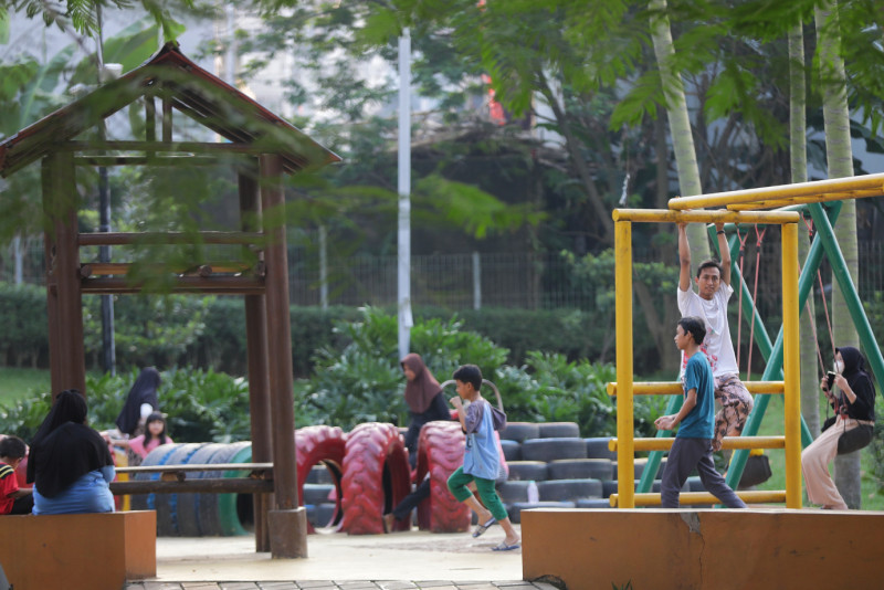 Sejumlah warga berkunjung ke Taman Delonix, di Jalan Tipar RW 07 Pekayon, Pasar Rebo, Jakarta Timur, Senin (26/6). Para pengunjung menikmati sore di Taman Delonix untuk berolahraga dan bercengkrama dengan teman dan keluarga.
