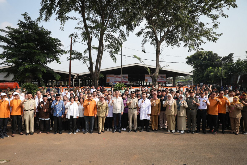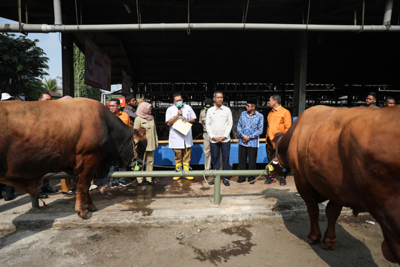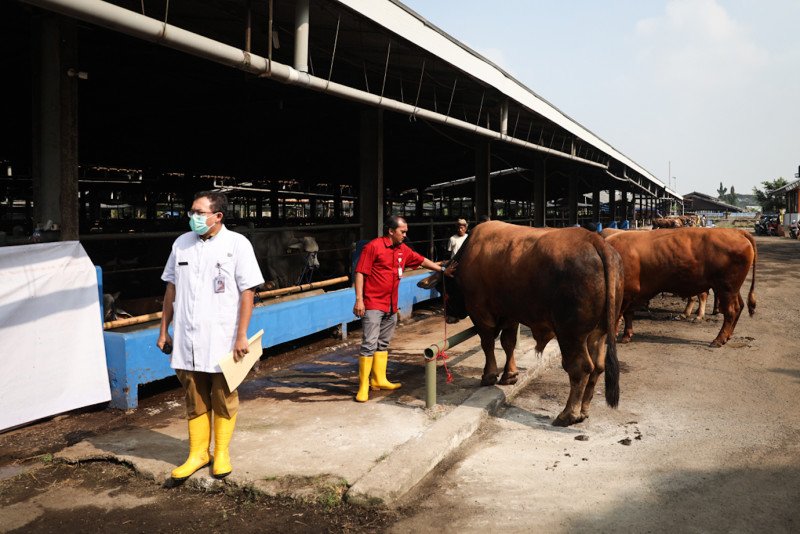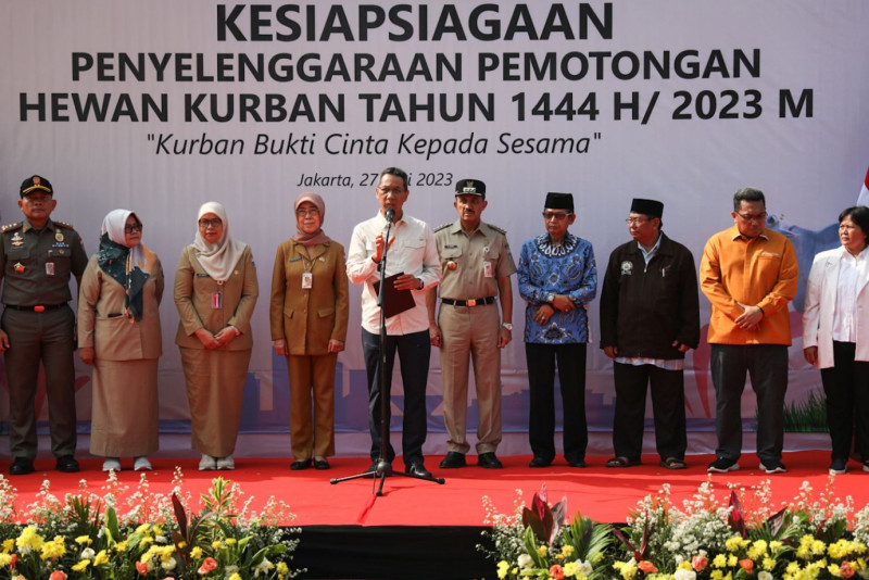 Penjabat (Pj) Gubernur Provinsi DKI Jakarta, Heru Budi Hartono melepas 700 petugas pemeriksa kesehatan hewan kurban di Perumda Dharma Jaya, Cakung, Jakarta Timur, Selasa (27/6). Ratusan petugas tersebut terdiri dari jajaran Dinas Dinas Ketahanan Pangan, Kelautan dan Pertanian (KPKP) DKI Jakarta, unsur Fakultas Kedokteran Institut Pertanian Bogor (IPB), Persatuan Dokter Hewan Indonesia (PDHI) cabang Jakarta, Perumda Dharma Jaya dan didukung oleh Asosiasi Juru Sembelih Halal, MUI dan DKM DKI Jakarta.