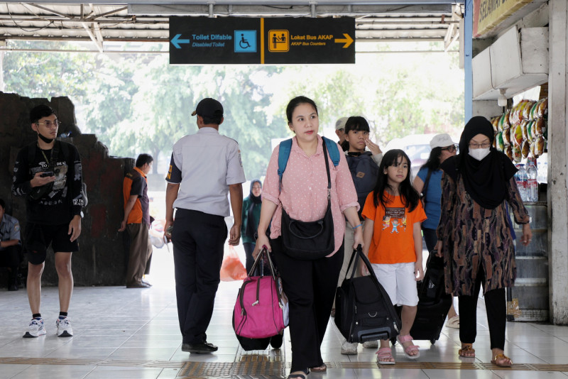 H-1 Lebaran Iduladha Tahun 2023 pemudik mulai memadati Terminal Kampung Rambutan, Ciracas, Jakarta Timur, Rabu (28/6). Sejak tanggal 24 Juni 2023 Terminal Kampung Rambutan mulai mengalami peningkatan penumpang yang ingin pulang ke kampung halaman untuk merayakan Hari Raya Iduladha 1444 Hijriah.