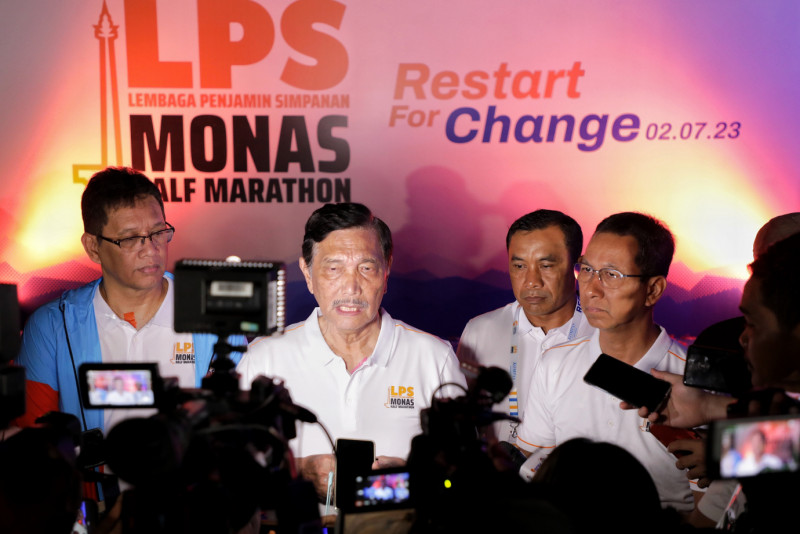 Penjabat (Pj) Gubernur DKI Jakarta, Heru Budi Hartono bersama Menteri Koordinator Bidang Kemaritiman dan Investasi RI, Luhut Binsar Pandjaitan menghadiri dan melepas ribuan pelari LPS Monas Half Marathon 2023, di Monumen Nasional (Monas), Jakarta Pusat, Minggu (2/7). Sebanyak 4.700 pelari baik dari dalam maupun luar negeri ikut meramaikan ajang lomba lari LPS Monas Half Marathon 2023.