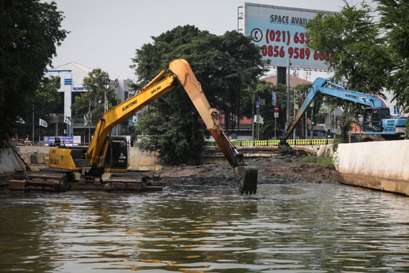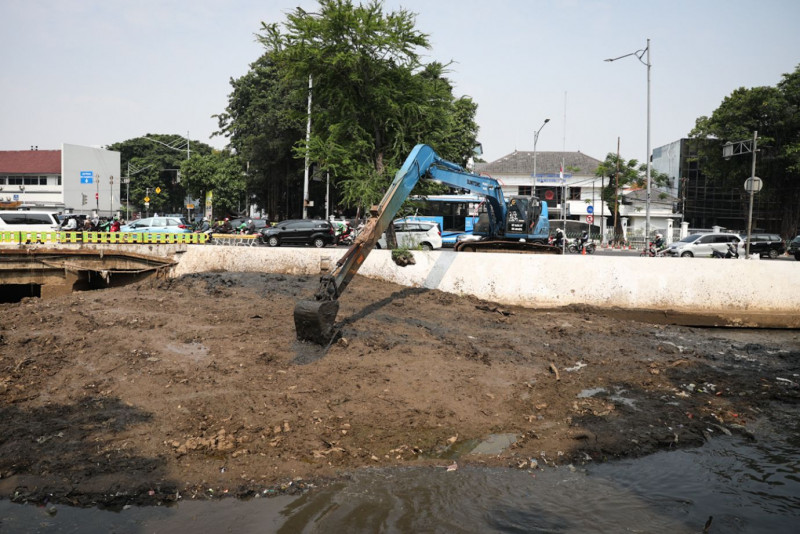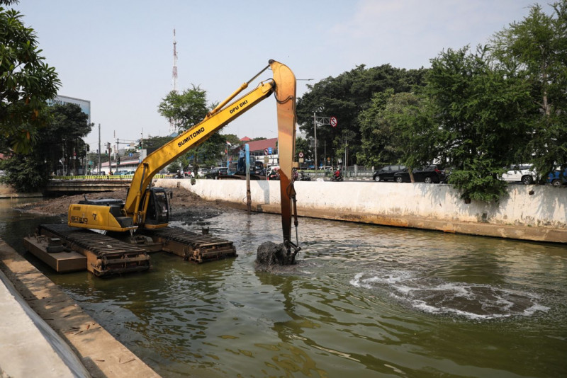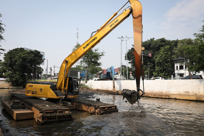 Petugas Suku Dinas Sumber Daya Air (SDA) Jakarta Pusat mengeruk lumpur di Kali Ciliwung segmen Pasar Baru di sisi Jalan Dr Sutomo, Kecamatan Sawah Besar, Jakarta Pusat, Senin (3/7). Pengerukan yang bertujuan untuk meningkatkan daya tampung kali tersebut menggunakan alat berat ekskavator long arm dan ekskavator amfibi masing-masing satu unit.