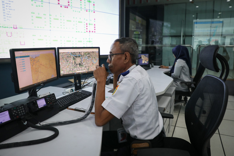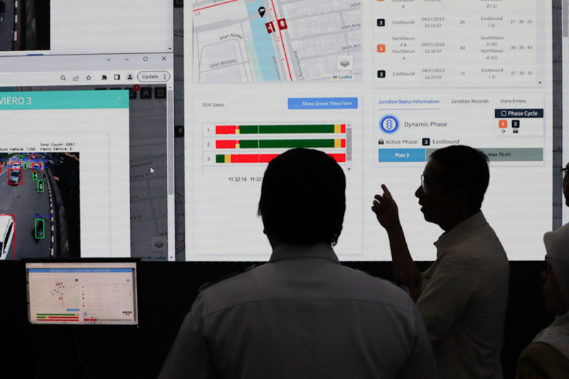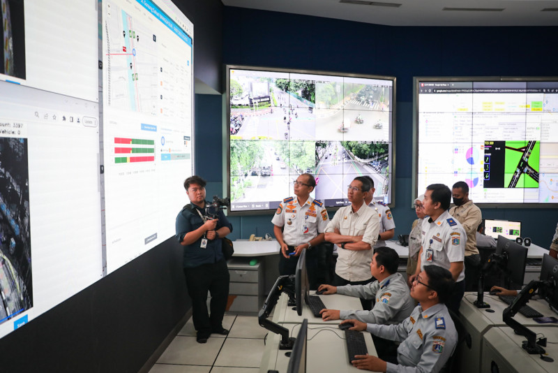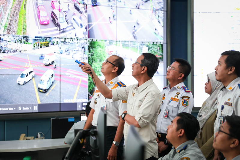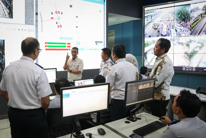 Penjabat (Pj) Gubernur DKI Jakarta, Heru Budi Hartono meninjau Network Operation Center (NOS) ITS Traffic Light Dinas Perhubungan (Dishub) DKI Jakarta di Gedung Dinas Teknis, Jalan Abdul Muis, Gambir, Jakarta Pusat, Selasa (4/7). Tinjauan Heru tersebut untuk melihat cara kerja dan efektivitas teknologi kecerdasan buatan atau artificial intelligence (AI) yang terpasang di sejumlah lampu lalu lintas persimpangan jalan di Jakarta.