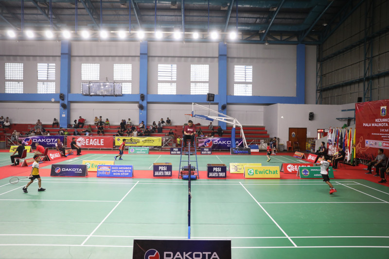 Sejumlah atlet usia dini mengikuti Kejuaraan Kota Persatuan Bulutangkis Seluruh Indonesia (Kejurkot PBSI) Piala Wali Kota Jakarta Timur di Gelanggang Remaja Pulogadung, Jakarta Timur, Rabu (5/7). Sebanyak 825 atlet dari 77 klub dengan kategori pra dini hingga dewasa yang ada di Jakarta Timur bersaing mendapatkan tempat untuk mewakili Jakarta Timur di kejuaraan tingkat provinsi.