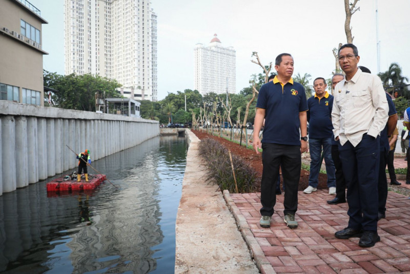 Penjabat (Pj) Gubernur DKI Jakarta, Heru Budi Hartono bersama Wali Kota Jakarta Utara, Ali Maulana Hakim melakukan penanaman pohon bersama di lokasi penataan kawasan Jalan Agung Perkasa 8, Sunter Agung, Tanjung Priok, Jakarta Utara, Jumat (7/7). Sebanyak 100 pohon tabebuya kuning ditanam di lokasi penataan kawasan seluas 3.263 meter persegi tersebut.