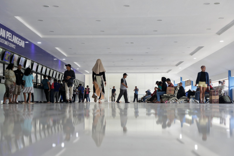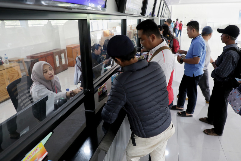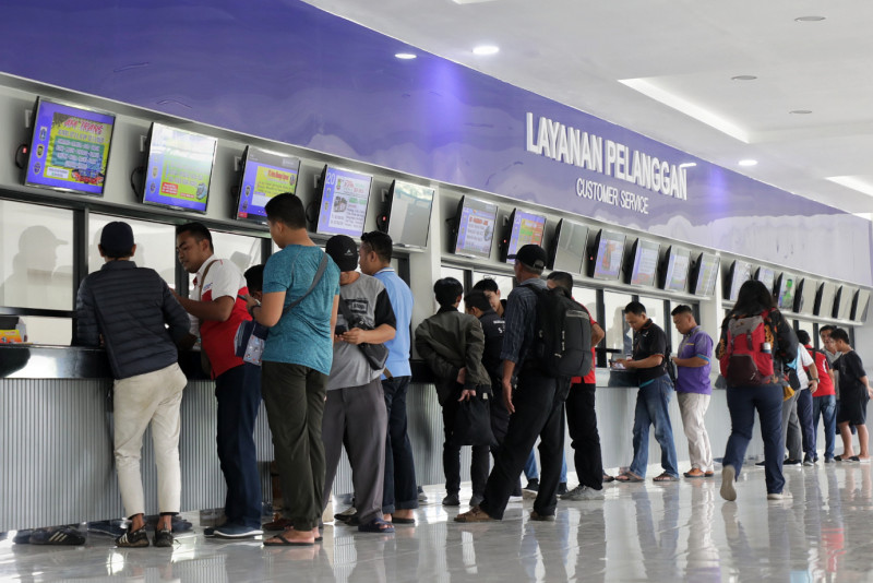 Sejumlah calon penumpang membeli tiket di loket lantai dua Terminal Kampung Rambutan, Jakarta Timur, Sabtu (8/7). Sebelumnya, sebanyak 31 loket bus antar kota antar provinsi (AKAP) di Terminal Bus Kampung Rambutan sudah dipindahkan dari lantai dasar ke lantai dua terminal. Tiap loket dapat melayani 120 Perusahaan Otobus atau PO yang ada.