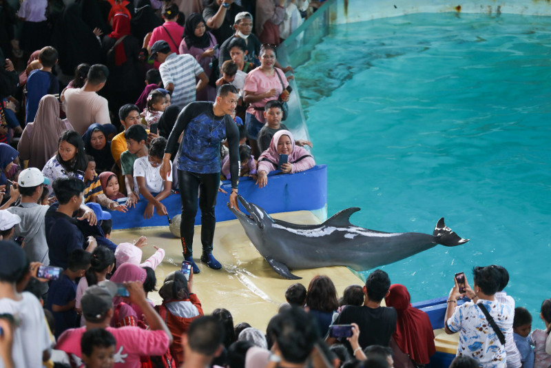Pengunjung menyaksikan atraksi sepasang lumba-lumba di Ocean Dream Samudra Ancol Taman Impian, Jakarta Utara, Selasa (11/7). Mengacu pada Surat Edaran Nomor Nomor e-0035/SE/2023 tentang Pelaksanaan Hari Pertama Sekolah (HPS) dan Masa Pengenalan Lingkungan Sekolah (MPLS) Bagi Peserta Didik Baru Tahun Pelajaran 2023/2024, masa libur sekolah diperpanjang hingga hari ini. Hal tersebut membuat Ancol Taman Impian diramaikan oleh pengunjung yang menghabiskan masa liburan bersama keluarga.