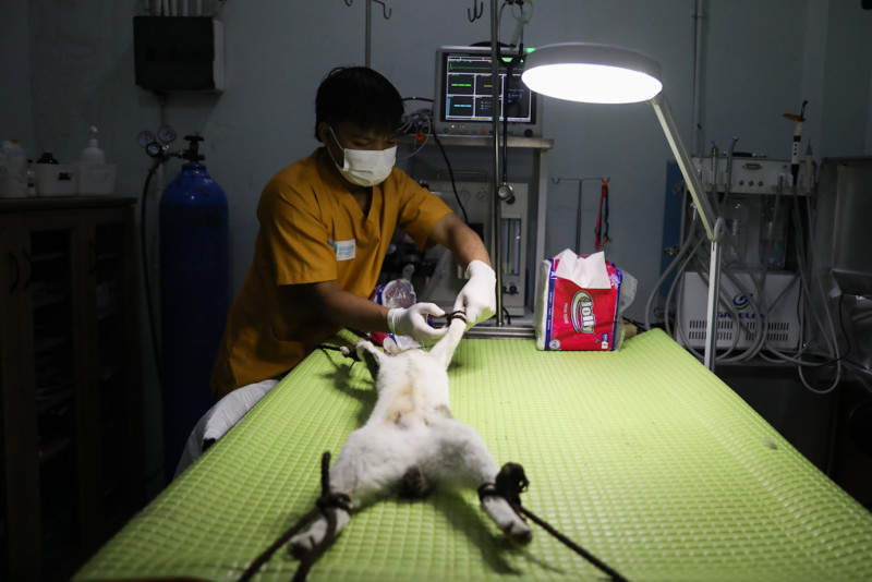 Dokter hewan melakukan sterilisasi kucing lokal berpemilik di klinik hewan Benben Petcare, Tanjung Priok, Jakarta Utara, Selasa (11/7). Program sterilisasi gratis kucing lokal ini merupakan program dari Suku Dinas Ketahanan Pangan, Kelautan dan Pertanian (Sudin KPKP) Jakarta Utara bekerja sama dengan Persatuan Dokter Hewan Indonesia (PDHI) Jakarta untuk menekan populasi kucing di wilayah Jakarta Utara.