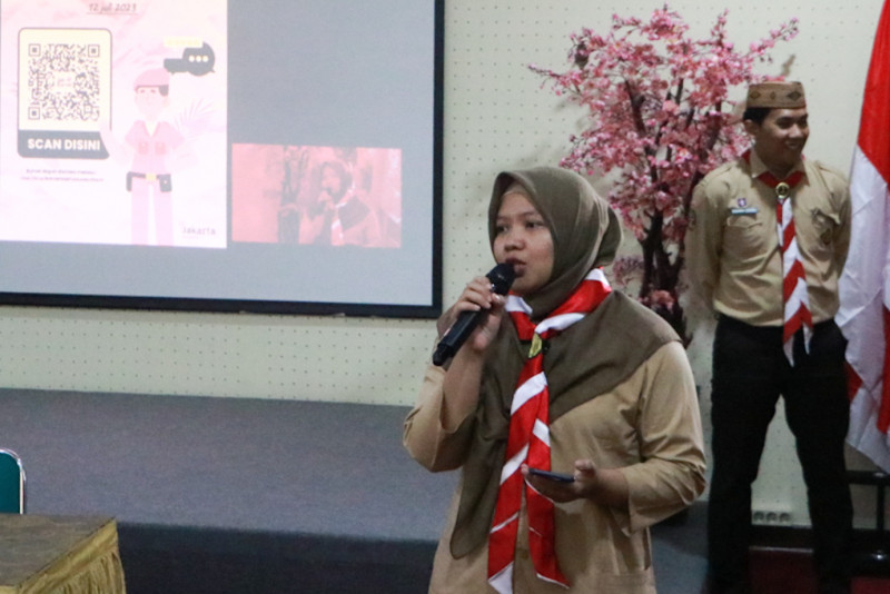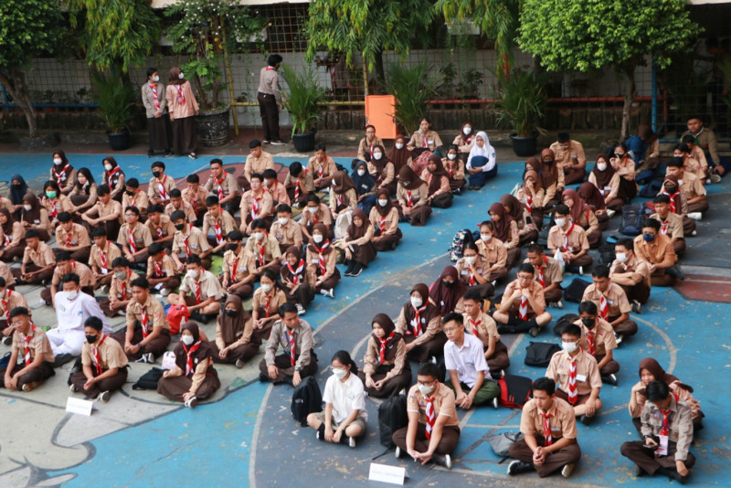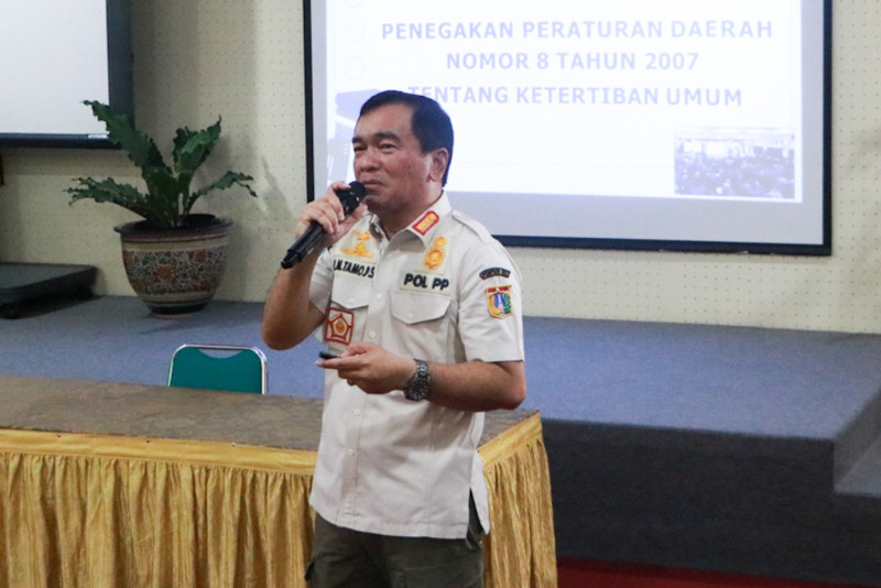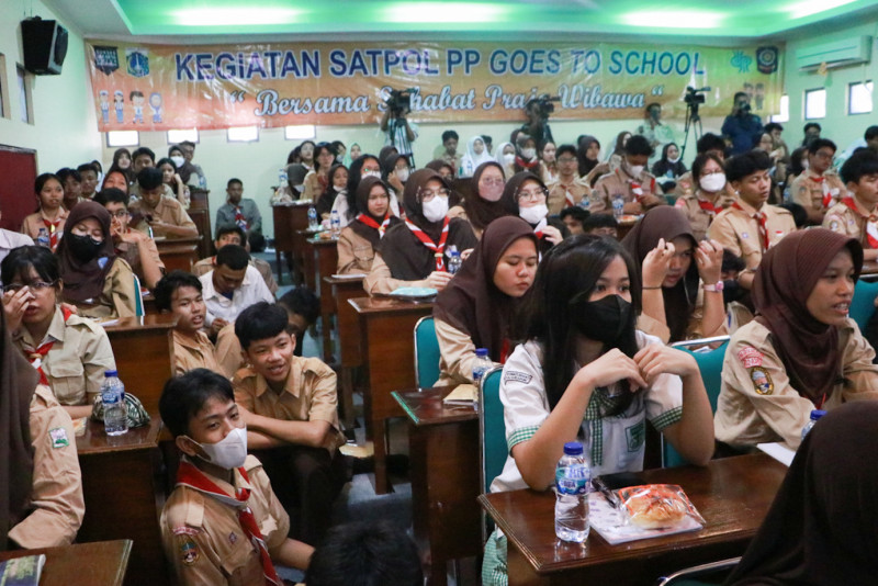 Satuan Polisi Pamong Praja (Satpol PP) DKI Jakarta menggelar kegiatan Satpol PP Goes to School bersamaan dengan Masa Pengenalan Lingkungan Sekolah (MPLS) di SMAN 8 Bukit Duri, Tebet, Jakarta Selatan, Rabu (12/7). Kegiatan ini digelar dalam rangka sosialisasi penegakan Peraturan Daerah Nomor 8 Tahun 2007 tentang Ketertiban Umum.