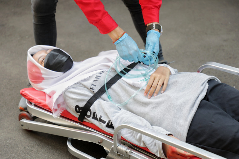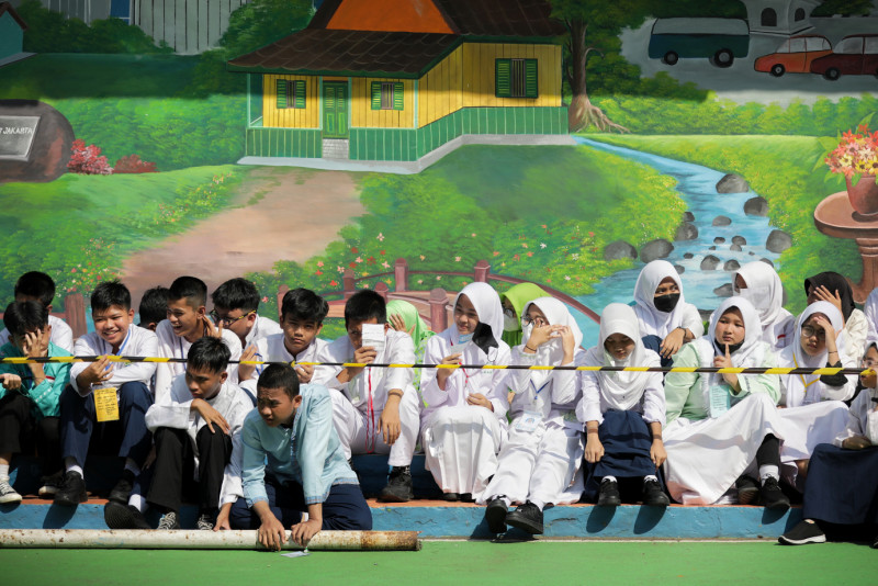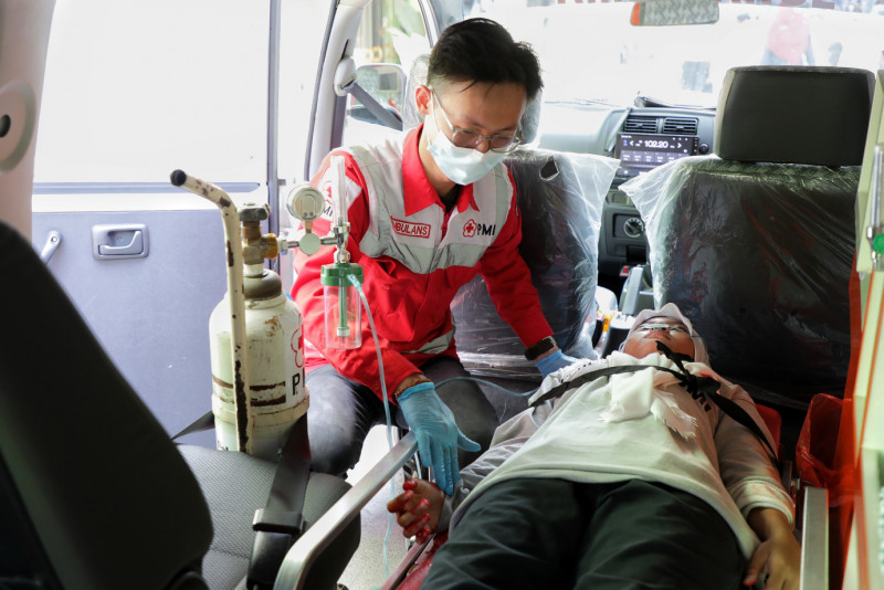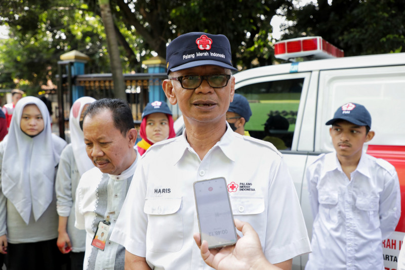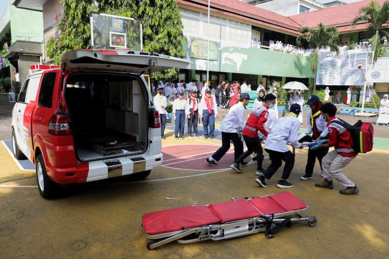 Palang Merah Indonesia (PMI) Jakarta Selatan membagikan ilmu mengenai kesiapsiagaan bencana kepada peserta didik dalam Masa Pengenalan Lingkungan Sekolah (MPLS) di SMKN 47 Jakarta, Jalan Condet Pejaten, Pejaten Barat, Pasar Minggu, Jakarta Selatan, Jumat (14/7). Dalam kegiatan ini PMI Jakarta Selatan mengerahkan 6 petugas dan satu pembina dalam melakukan sosialisasi, serta praktik simulasi mengenai kesiapsiagaan bencana, terutama menggunakan ambulans.