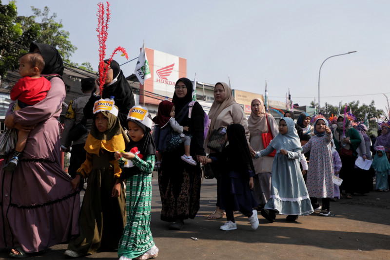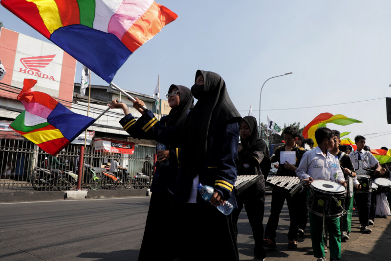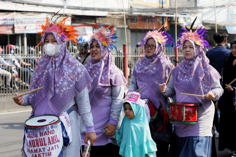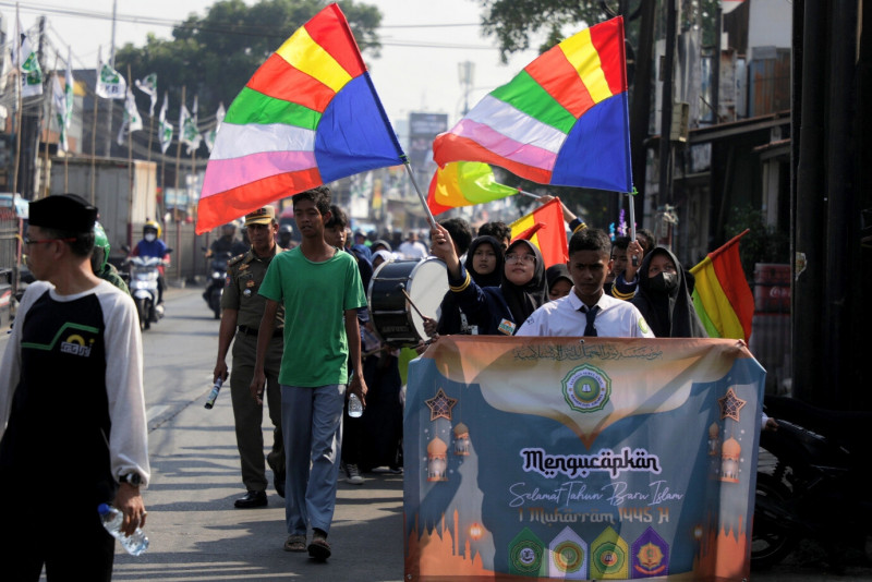 Sejumlah pelajar melakukan pawai di Jalan Raya Bogor, Kramat Jati, Jakarta Timur, Selasa (18/7). Pawai tersebut dilakukan dalam rangka menyambut Tahun Baru Islam 1 Muharam 1445 Hijriah di Jakarta.