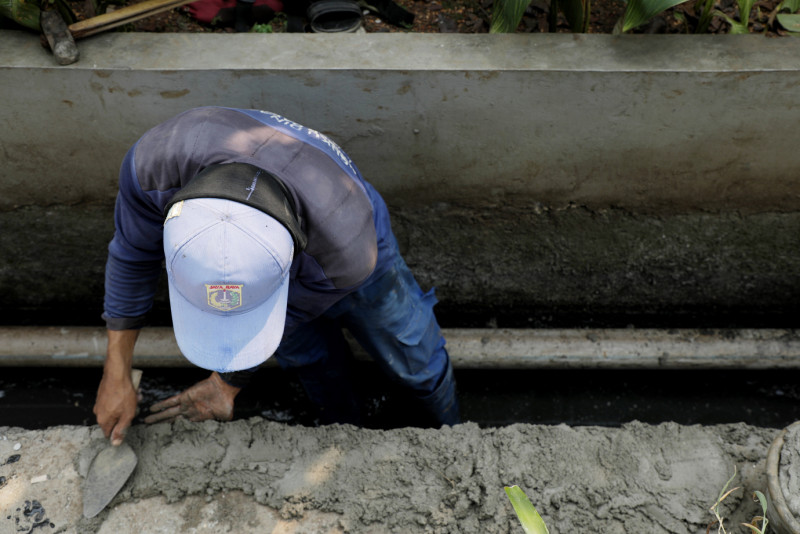 Petugas Suku Dinas Sumber Daya Air (Sudin SDA) Jakarta Timur melakukan perbaikan turap saluran air di Jalan Raya Poncol, Ciracas, Jakarta Timur, Jumat (21/7). Perbaikan turap saluran air sepanjang 24 meter dan tinggi 80 sentimeter ditargetkan rampung tiga hari mendatang .