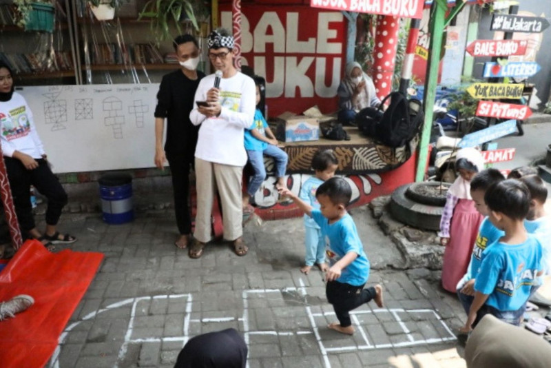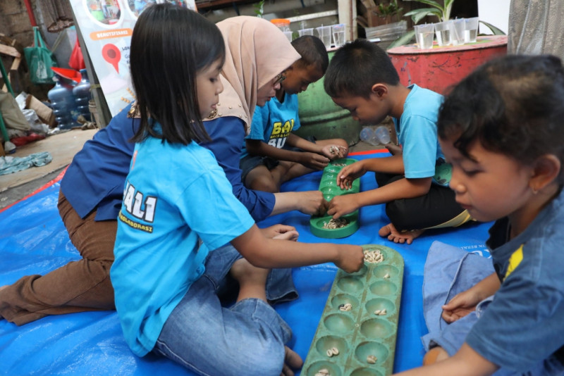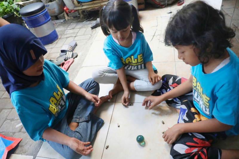 Dalam memperingati Hari Anak Nasional 2023 Komunitas Bale Buku Jakarta memperkenalkan permainan tradisional kepada anak-anak di Bale Buku Jali-Jali 48, Gang Dendrit, Cakung Barat, Cakung, Jakarta Timur, Sabtu (22/7). Permainan tradisional yang dikenalkan seperti permainan bekel, kelereng, tapak gunung serta congklak. Kegiatan ini juga bertujuan untuk melestarikan permainan tradisional kepada anak-anak agar tidak punah termakan zaman.