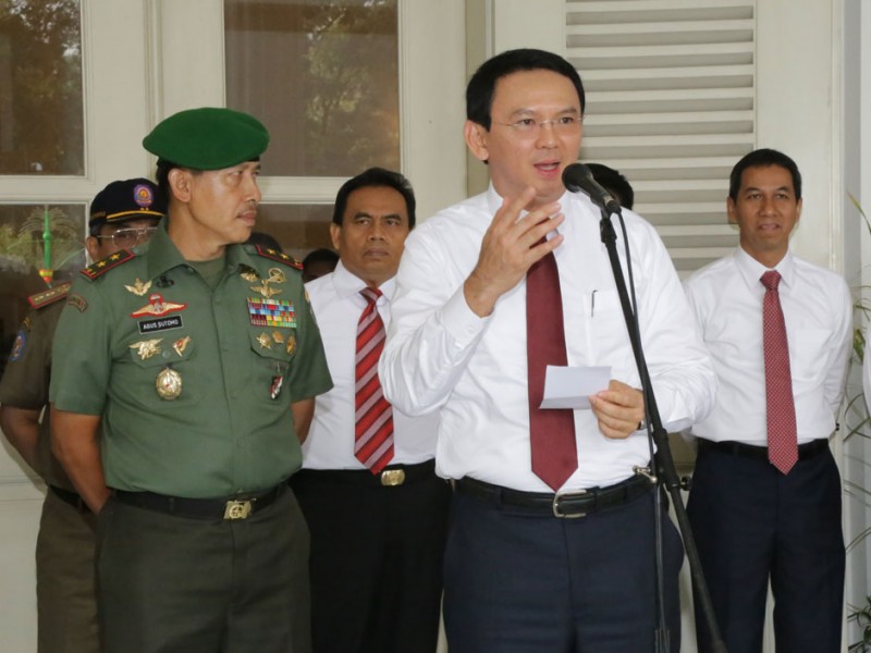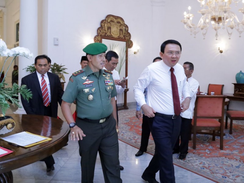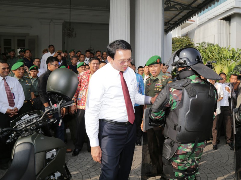 Gubernur DKI Jakarta, Basuki Tjahaja Purnama dan Pangdam Jaya, Mayjen Agus Sutomo melakukan serah terima hibah di Balaikota DKI Jakarta, Jumat (07/08/2015). Pemprov DKI Jakarta memberikan hibah senilai Rp 50,8 miliar untuk pembelian sarana dan prasarana prajurit Kodam Jaya yang akan digunakan membantu pengamanan di Ibukota.(Foto: Yopie / Beritajakarta.com)