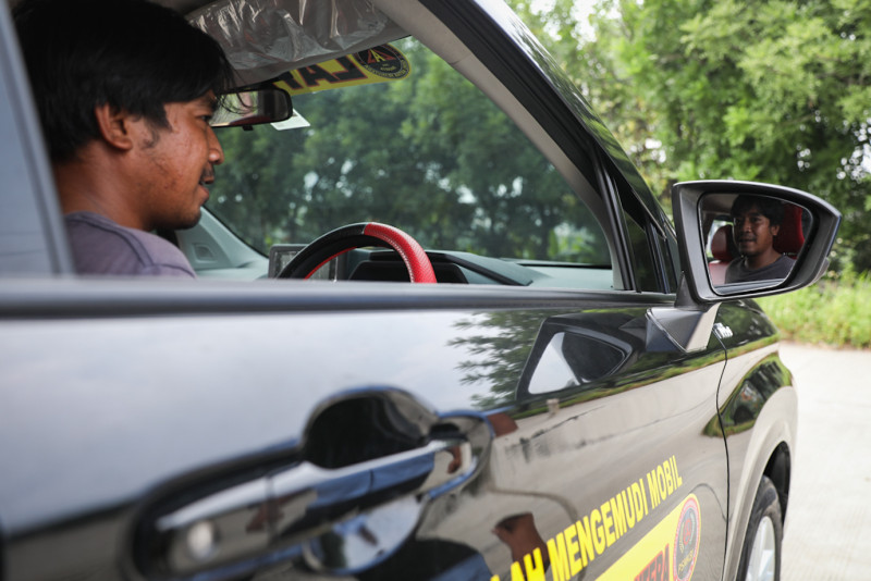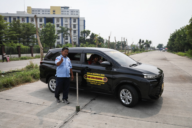 Sejumlah peserta mengikuti pelatihan mengemudi yang diadakan oleh Suku Dinas Tenaga Kerja, Transmigrasi dan Energi (Sudin Nakertransgi) Jakarta Timur di Jalan Inspeksi BKT Timur, Pulo Gebang, Jakarta Timur, Selasa (25/7). Pelatihan dilaksanakan selama 12 hari dan diakhiri dengan ujian praktik di Satpas SIM hingga mendapatkan Surat Izin Mengemudi (SIM) A.