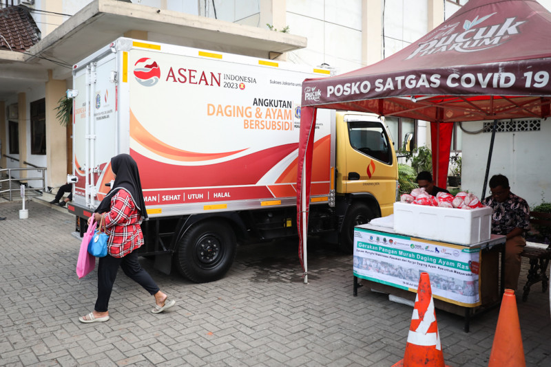 Perumda Dharma Jaya menggelar gerakan pangan murah daging ayam ras di halaman Kantor Kelurahan Cipinang Muara, Jatinegara, Jakarta Timur, Kamis (27/7). Daging ayam ras yang dijual berbobot 0,9 - 1 kilogram dengan harga Rp35 ribu per ekor. Penjualan daging ayam ras murah tersebar di berbagai lokasi sejak tanggal 18 Juli hingga 1 Agustus 2023.