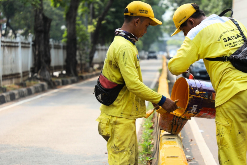 Petugas Suku Dinas Bina Marga Jakarta Pusat melakukan pengecatan beton pembatas jalan atau Movable Concrete Barrier (MCB) Transjakarta di sepanjang Jalan Letjen Suprapto, Galur, Johar Baru, Kamis (27/7). Pengecatan sepanjang 300 meter ini dikerjakan oleh 12 petugas dan ditargetkan rampung dalam waktu satu minggu.