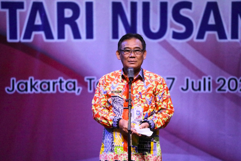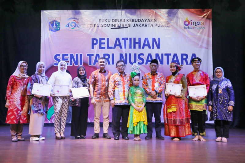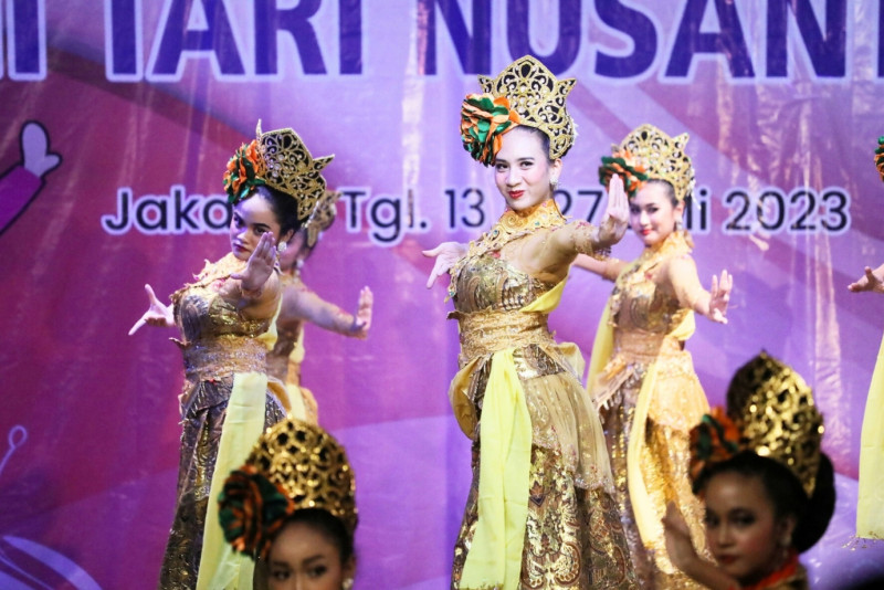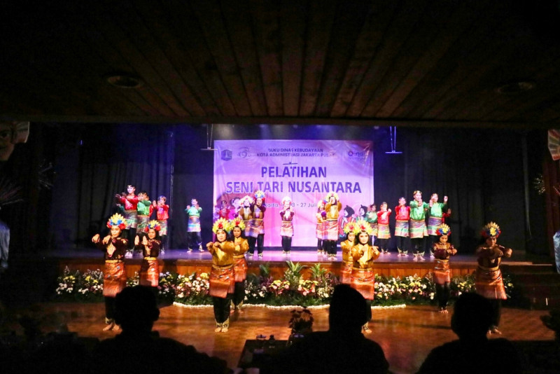Suku Dinas Kebudayaan Jakarta Pusat menggelar pertunjukkan Seni Tari Nusantara di Gedung Pusat Pelatihan Seni Budaya (PPSB) Jakarta Pusat, Jalan KH Mas Mansyur, Tanah Abang, Jakarta Pusat, Kamis (27/7). Sebanyak 90 peserta menunjukkan kebolehan menari setelah mereka mengikuti pelatihan selama 10 hari dari tanggal 13-27 Juli 2023.