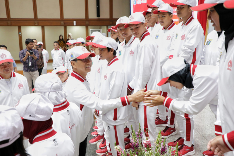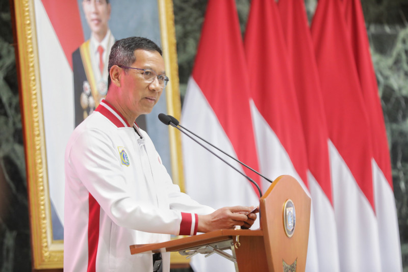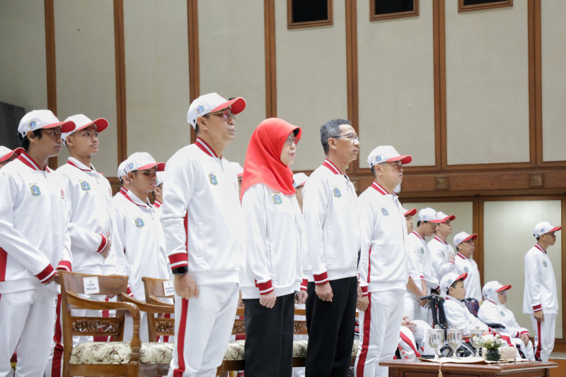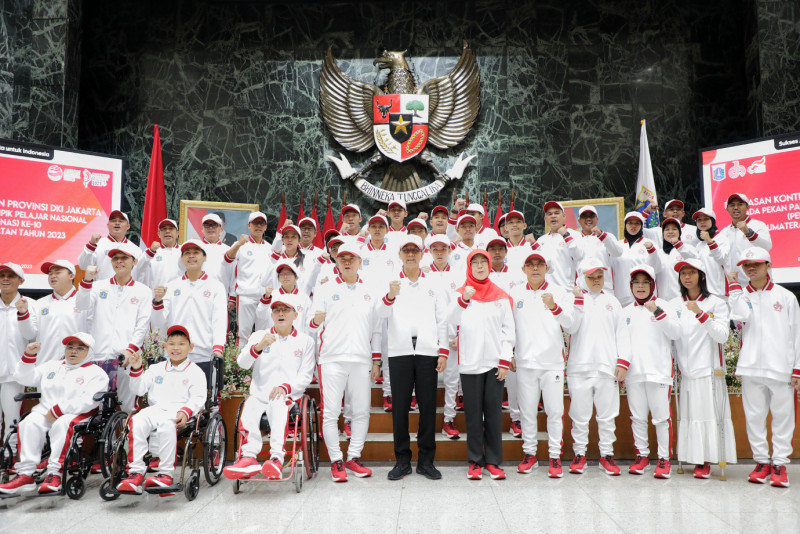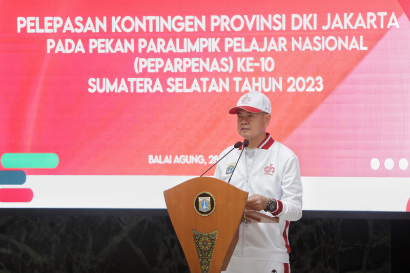 Penjabat (Pj) Gubernur DKI Jakarta, Heru Budi Hartoni melepas kontingen DKI Jakarta dalam Pekan Paralimpik Pelajar Nasional (Peparpenas) ke-X tahun 2023 di Balai Kota DKI Jakarta, Jumat (28/7). Papernas ke-X yang akan digelar mulai 29 Juli hingga 5 Agustus 2023 di Palembang, Sumatera Selatan tersebut akan diikuti oleh 22 atlet kontingen DKI Jakarta.