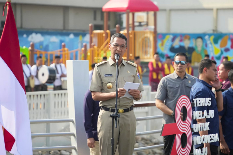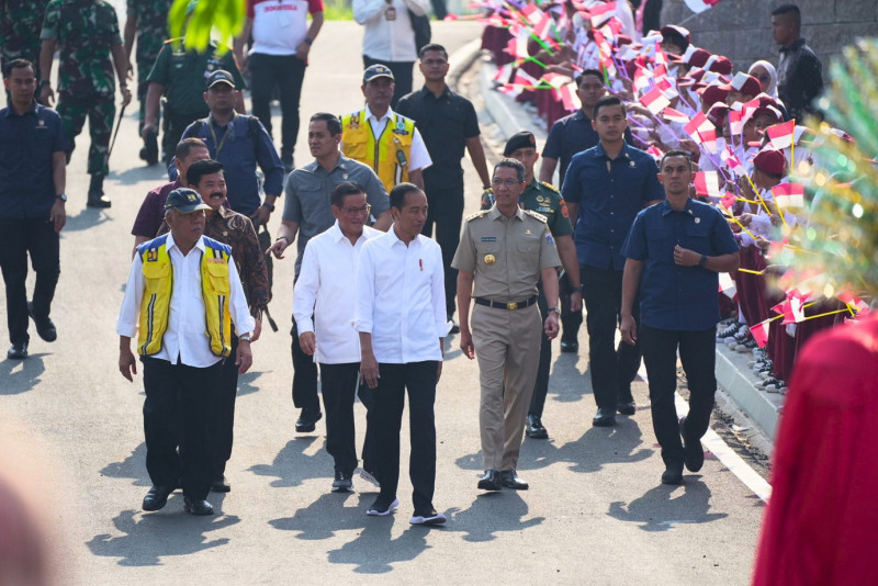 Penjabat (Pj) Gubernur DKI Jakarta, Heru Budi Hartono menghadiri peresmian proyek Sodetan Ciliwung oleh Presiden RI Joko Widodo (Jokowi) di Inlet (pintu masuk) Sodetan Kali Ciliwung-Kanal Banjir Timur (KBT), kawasan Bidara Cina, Jakarta Timur, Senin (31/7). Proyek Sodetan Ciliwung merupakan langkah pemerintah untuk mengatasi banjir di sebagian wilayah DKI Jakarta.