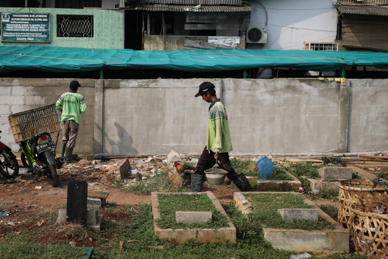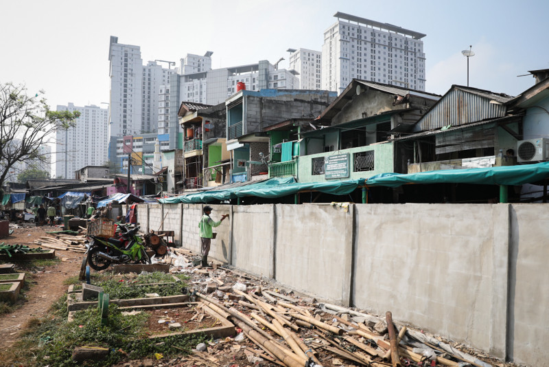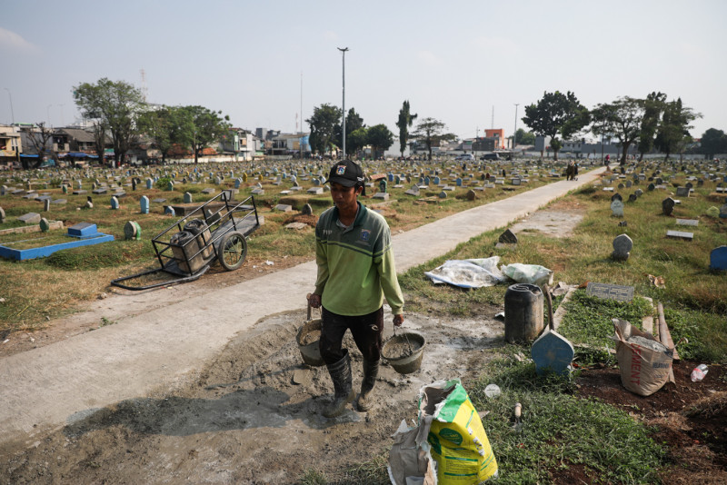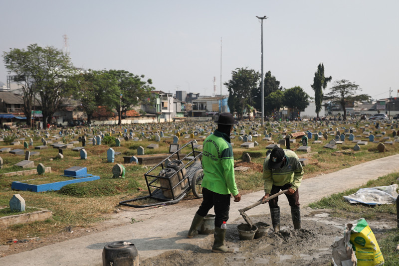 Suku Dinas Sudin Pertamanan dan Hutan Kota (Sudin Tamhut) Jakarta Timur membangun tembok pembatas di area selatan Taman Pemakaman Umum (TPU) Prumpung, Kelurahan Cipinang Besar Utara, Jatinegara, Jakarta Timur, Kamis (3/8). Tembok setinggi 1,5 meter dengan panjang 80 meter dibangun untuk membatasi area makam dan permukiman warga.