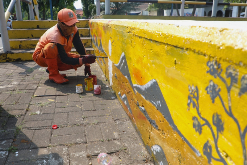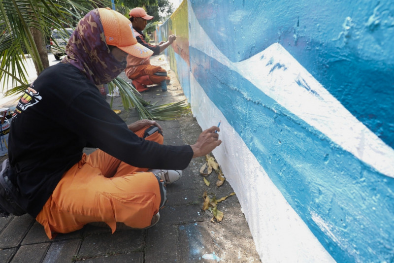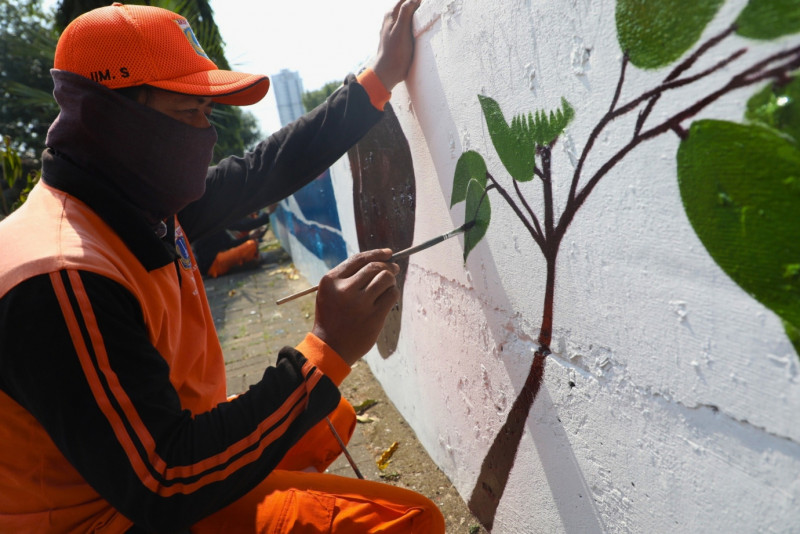 Petugas Penanganan Prasana dan Sarana Umum (PPSU) Kelurahan Cempaka Putih Barat menghias lingkungan dengan mural di Jalan Cempaka Putih Barat, tepatnya di turap aliran Kali Utan Kayu, Cempaka Putih, Jakarta Pusat, Selasa (8/8). Pengerjaan mural ini dimulai dari tanggal 26 Juli ditargetkan rampung selama dua minggu dengan mengerahkan tujuh petugas PPSU. Pembuatan mural ini merupakan bagian dari penataan kawasan wilayah triwulan ketiga Kelurahan Cempaka Putih Barat.