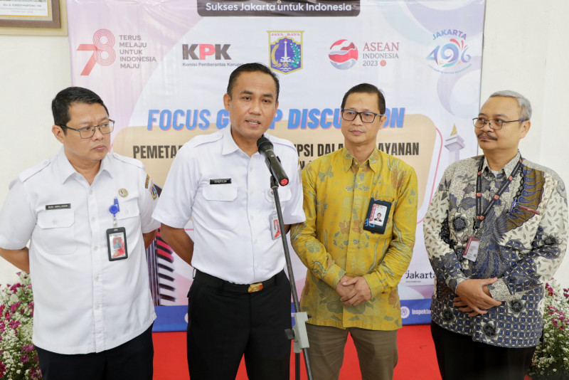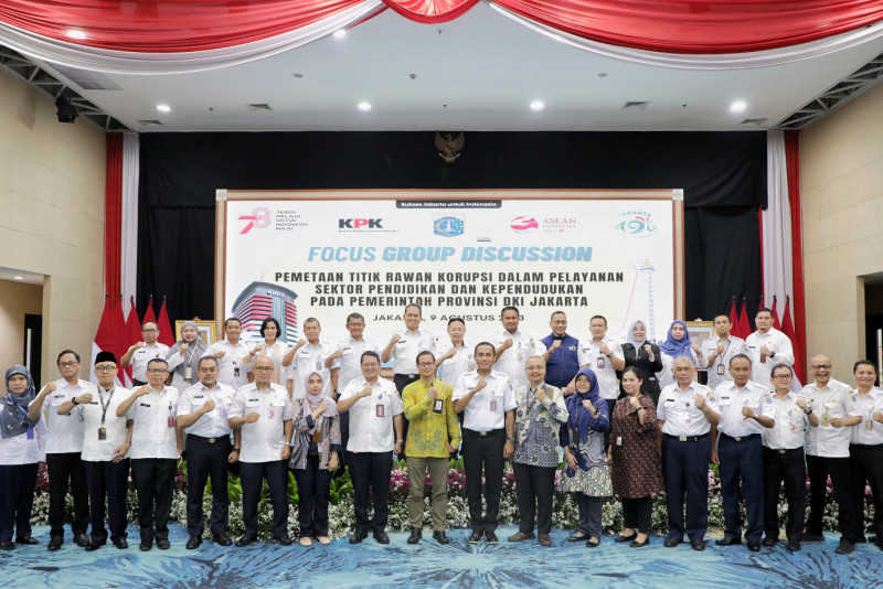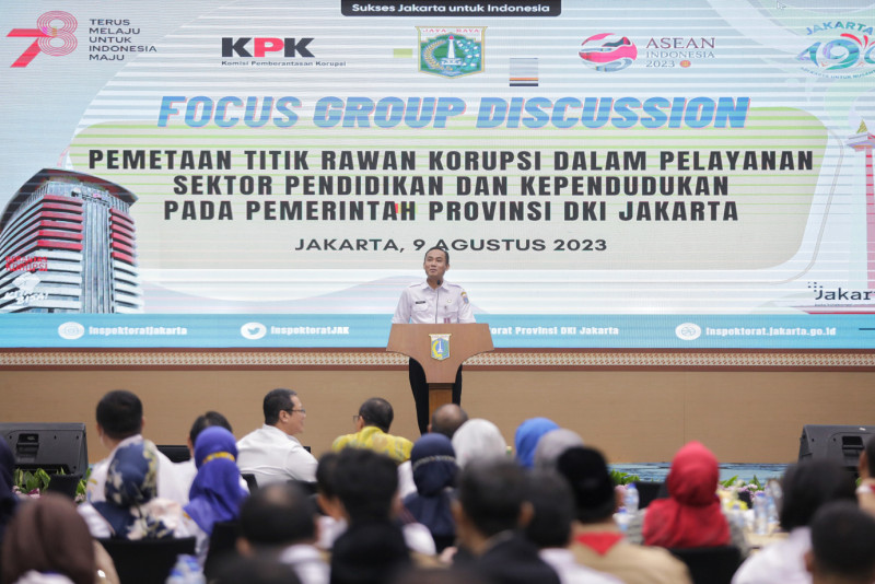 Inspektorat DKI Jakarta bersama Komisi Pemberantasan Korupsi Republik Indonesia (KPK RI) menggelar Focus Group Discussion (FGD) di Aula Ki Hajar Dewantara, Dinas Pendidikan DKI Jakarta, Jalan Jenderal Gatot Subroto, Setiabudi, Jakarta Selatan, Rabu (9/8). FGD dilakukan untuk memetakan titik rawan korupsi dalam pelayanan sektor pendidikan dan kependudukan di DKI Jakarta.