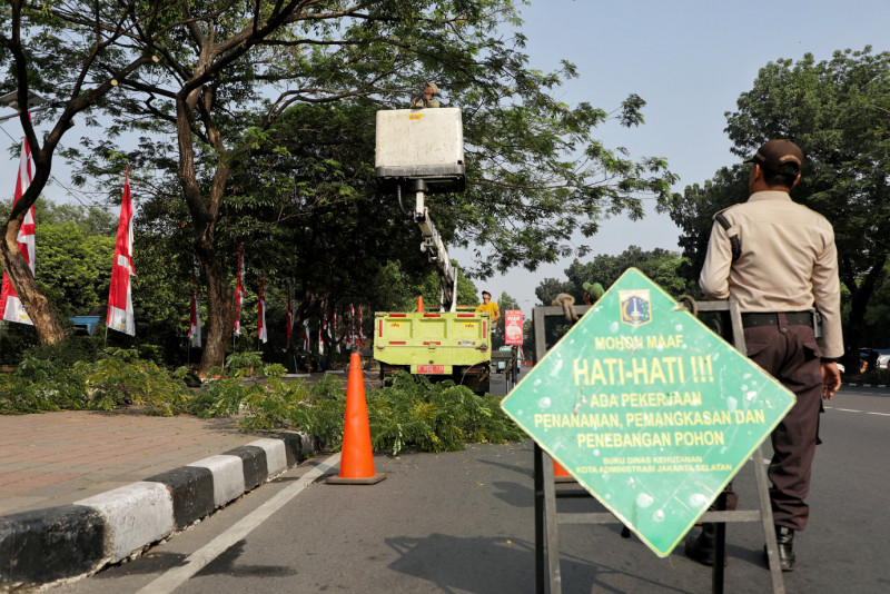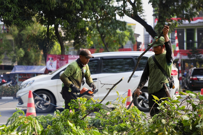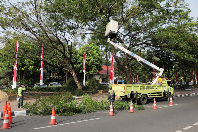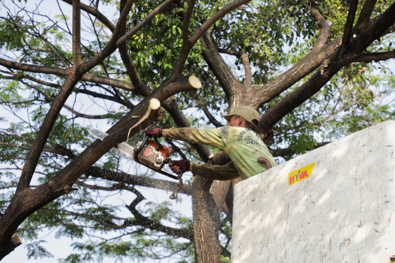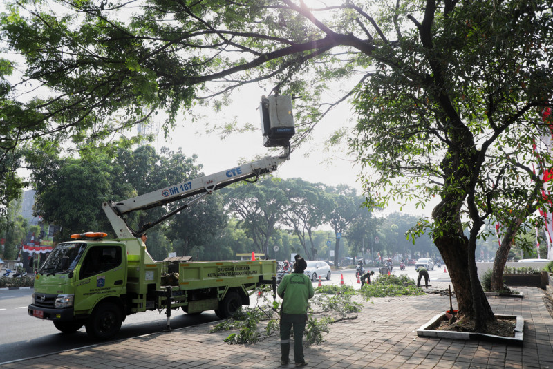Suku Dinas (Sudin) Pertamanan dan Hutan (Tamhut) Kota Jakarta Selatan melakukan penopingan pohon di Jalan Raya Kalibata, Kelurahan Kalibata, Kecamatan Pancoran, Jakarta Selatan, Kamis (10/8). Penopingan tersebut dilakukan atas permintaan pihak Taman Makam Pahlawan (TMP) Kalibata dalam rangka menyambut HUT Ke-78 Republik Indonesia (RI), pada tanggal 17 Agustus mendatang.