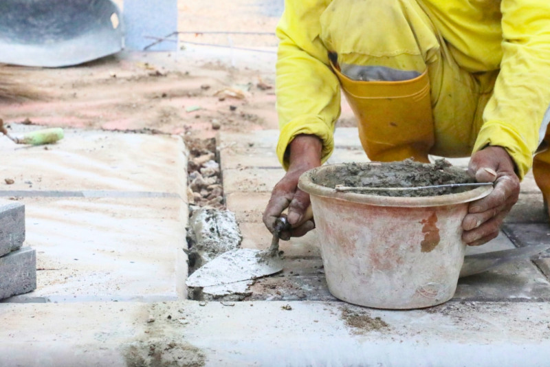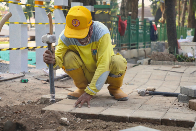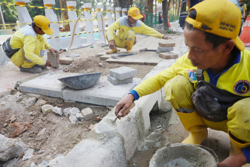 Suku Dinas Bina Marga Jakarta Pusat melakukan perbaikan trotoar di Jalan Taman Sukabumi, Menteng, Jakarta Pusat, Kamis (10/8). Perbaikan trotoar sepanjang 50 meter dan lebar 1,5 meter ini diperbaiki dengan mengganti paving block yang rusak dengan yang baru.