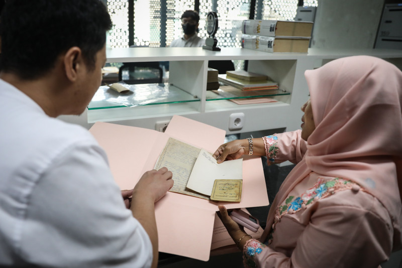 Keluarga menyerahkan koleksi buku dan arsip milik almarhum Ridwan Saidi kepada Dinas Perpustakaan dan Kearsipan (Dispusip) DKI Jakarta di Ruang Pusat Dokumentasi Sastra (PDS) HB Jassin di Gedung Panjang, Taman Ismail Marzuki (TIM), Menteng, Jakarta Pusat, Jumat (11/8). Penyerahan ratusan buku dan arsip secara simbolis tersebut diterima oleh Kepala Dispusip DKI Jakarta, Firmansyah, untuk dikelola dan dapat diakses oleh publik.
