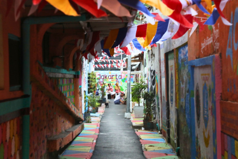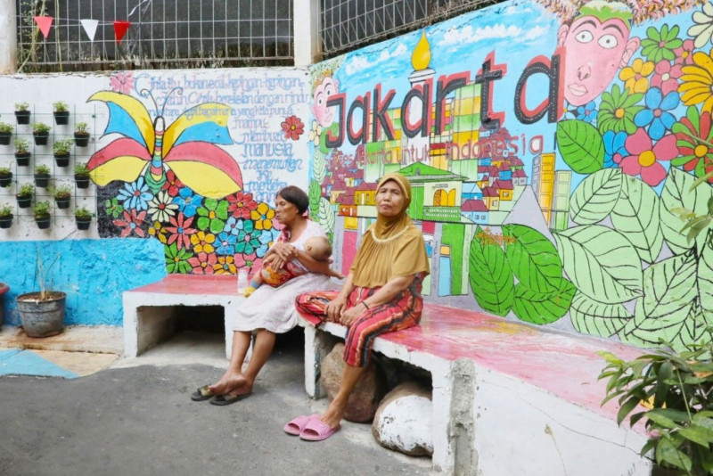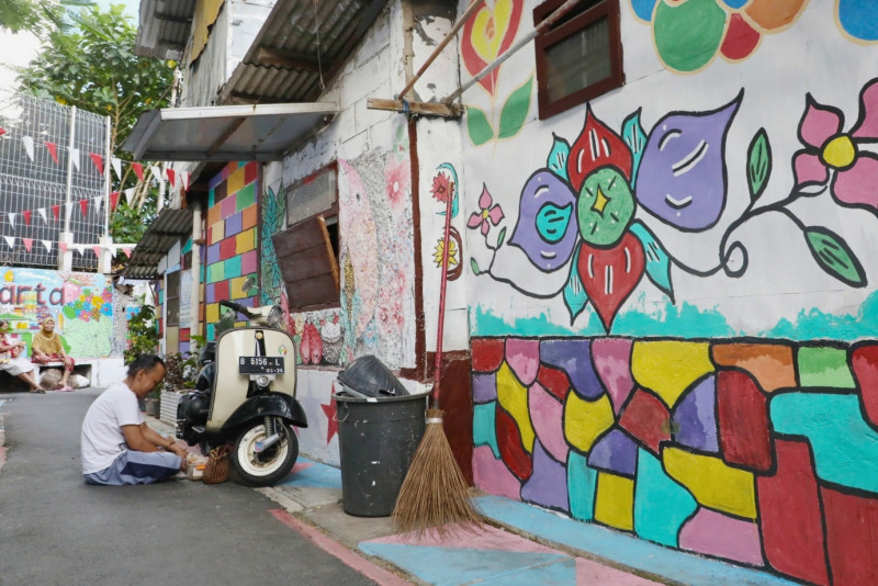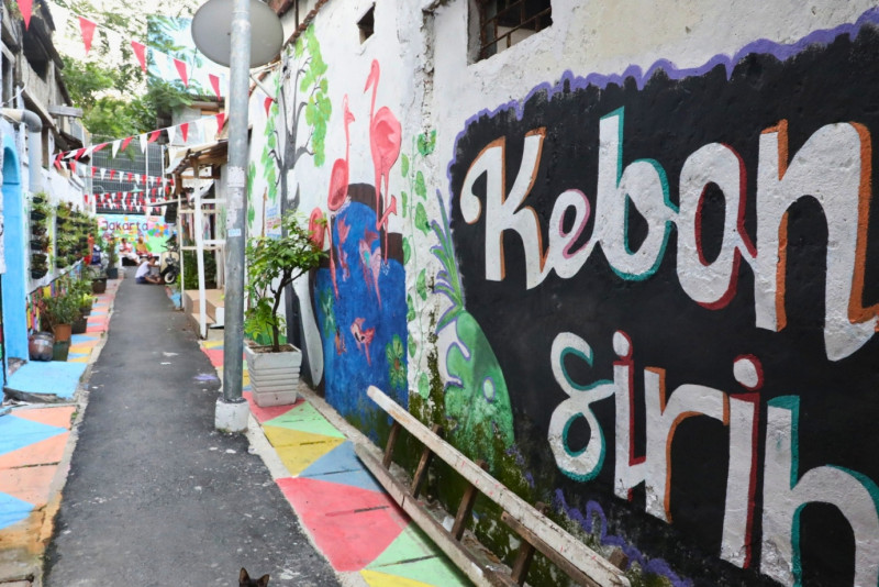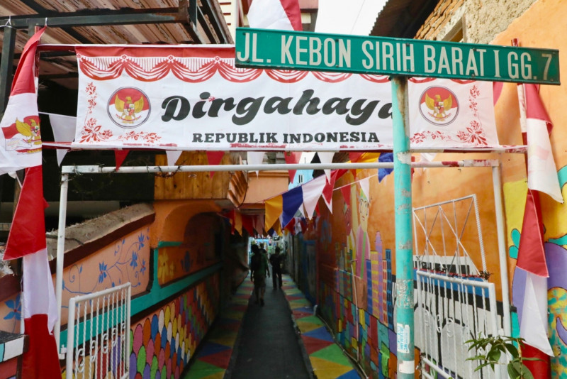 Melihat kawasan unggulan di Jalan Kebon Sirih Barat 1, Gg 7, RW 02/14, Kelurahan Kebon Sirih, Menteng Jakarta Pusat yang telah rampung dikerjakan, Selasa (15/8). Penataan kawasan dengan berbagai macam mural yang menggambarkan kota Jakarta ini merupakan hasil sinergitas dari warga RW 02, Karang Taruna dan PPSU Kebon Sirih.